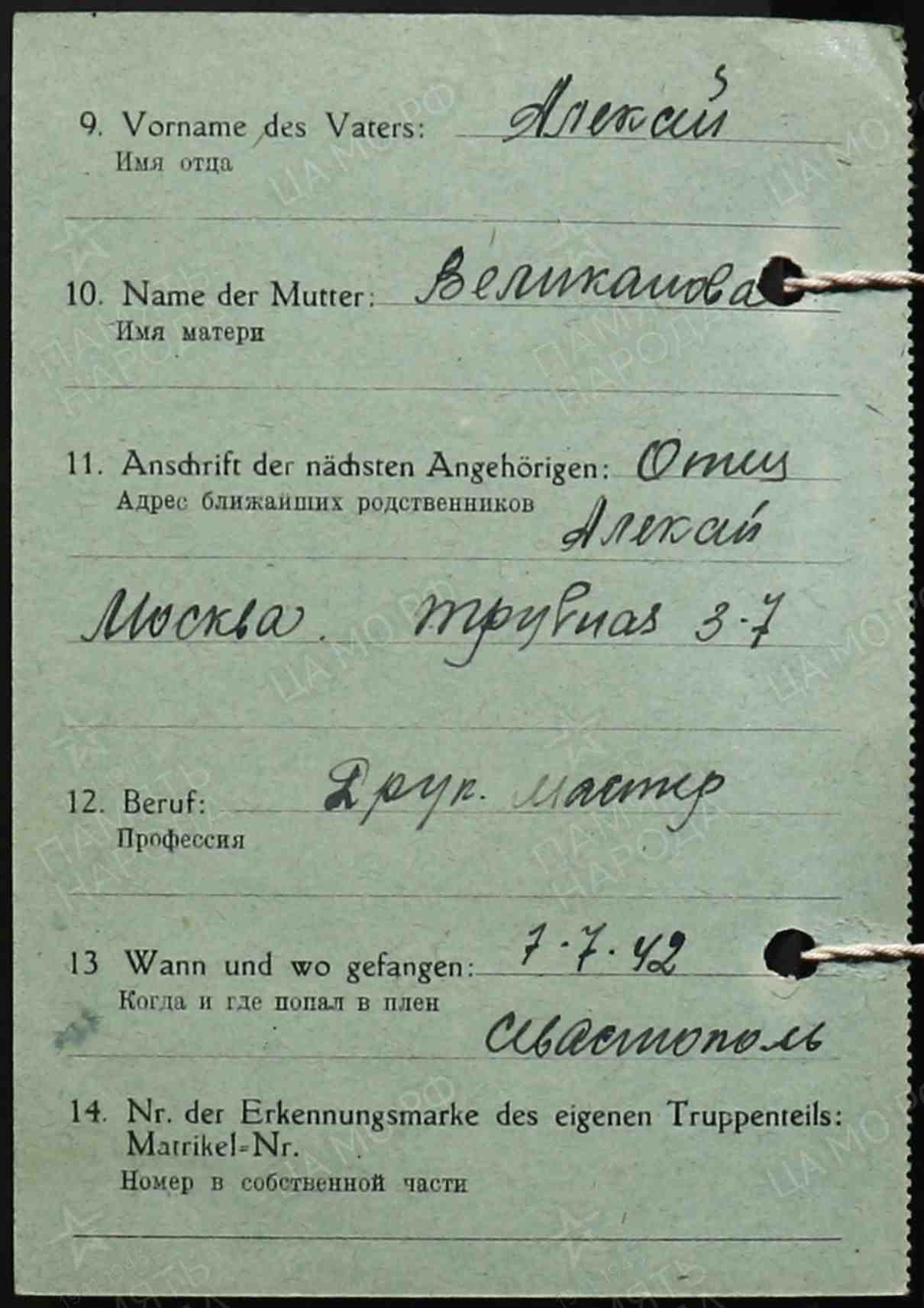 Карточка военнопленного
