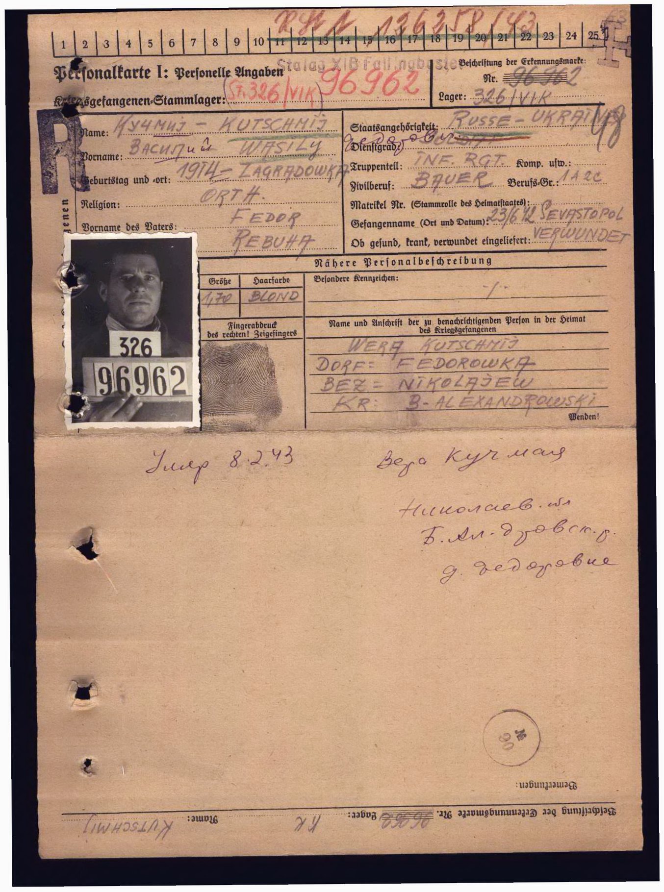 Дополнительно: Место призыва: Больше-Александровский РВК, Украинская ССР, Николаевская обл., Больше-Александровский р-н