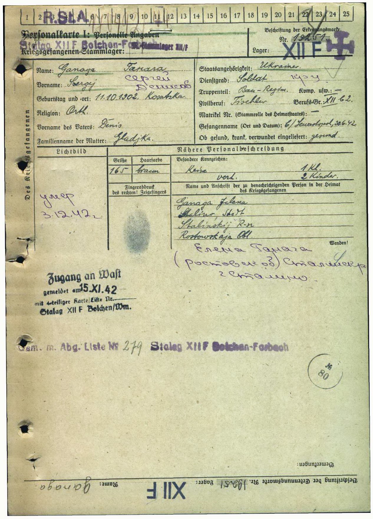 Дополнительно: Дата призыва: 27.08.1941 Место призыва: Сталинский ГВК, Украинская ССР, Сталинская обл., г. Сталино