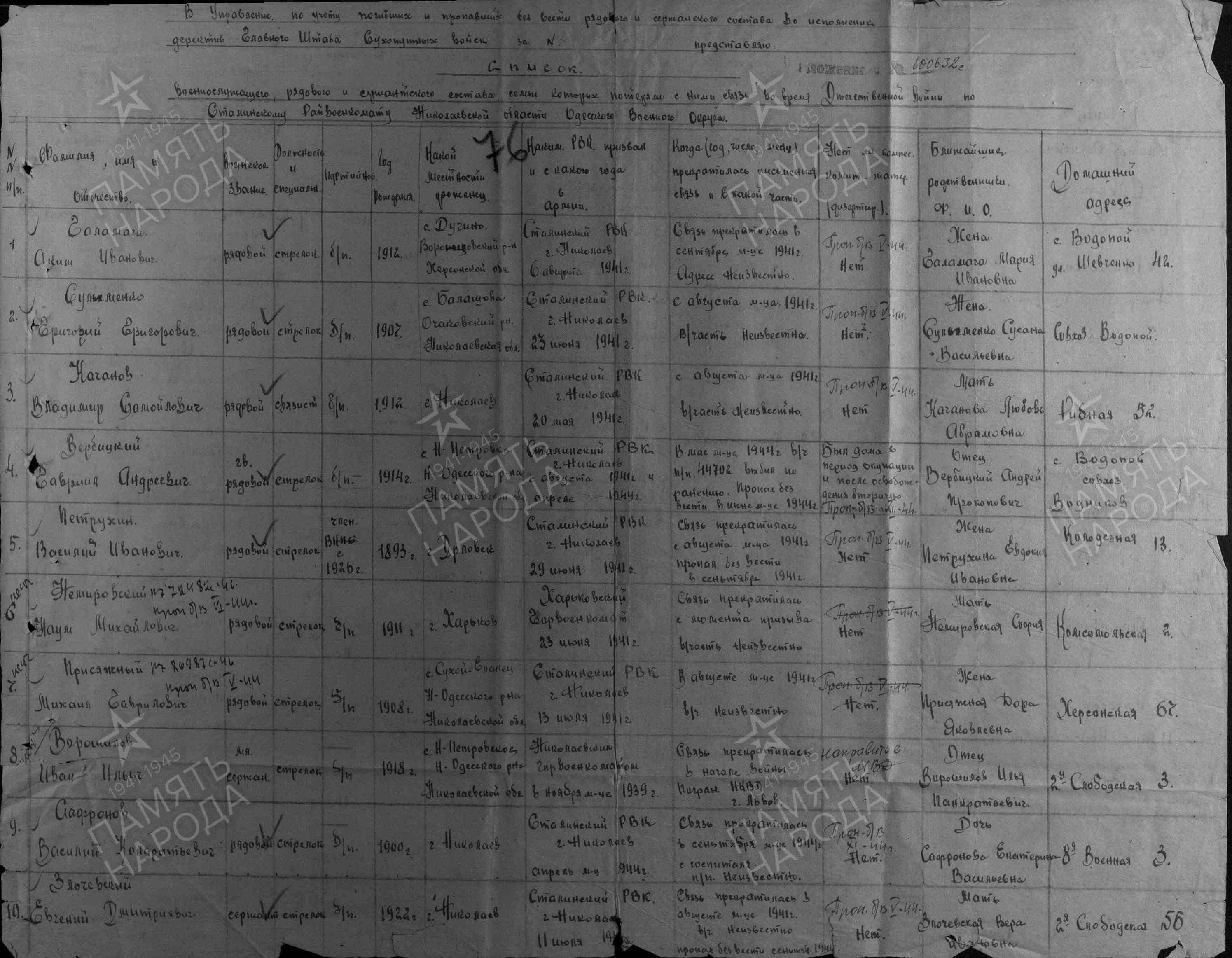 Дополнительно: Дата призыва: 06.08.1941 Место призыва: Сталинский РВК, Украинская ССР, Николаевская обл., г. Николаев, Сталинский р-н