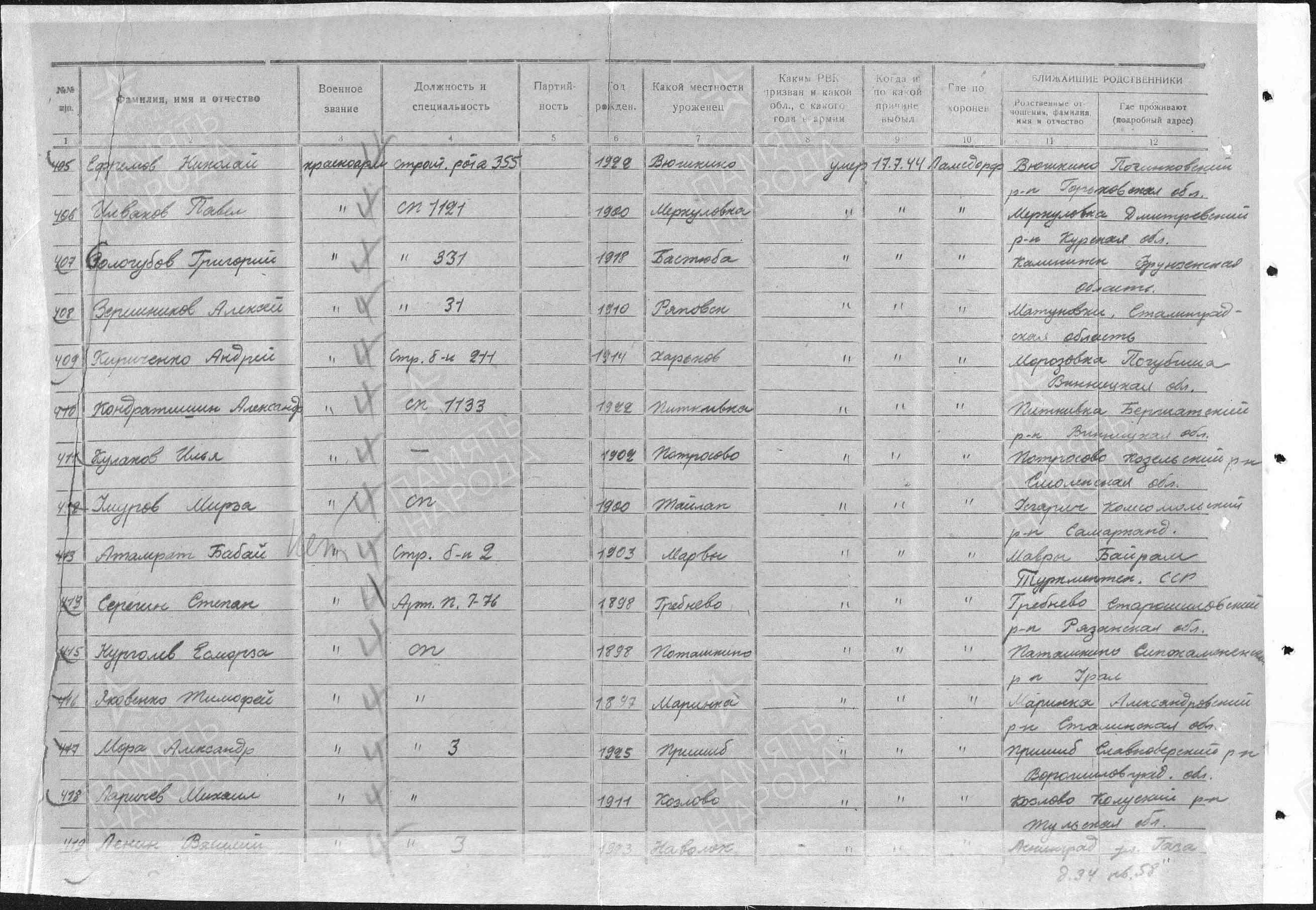 Дата призыва: 15.11.1941 Место призыва: Калининский РВК, Киргизская ССР, Фрунзенская обл., Калининский р-н