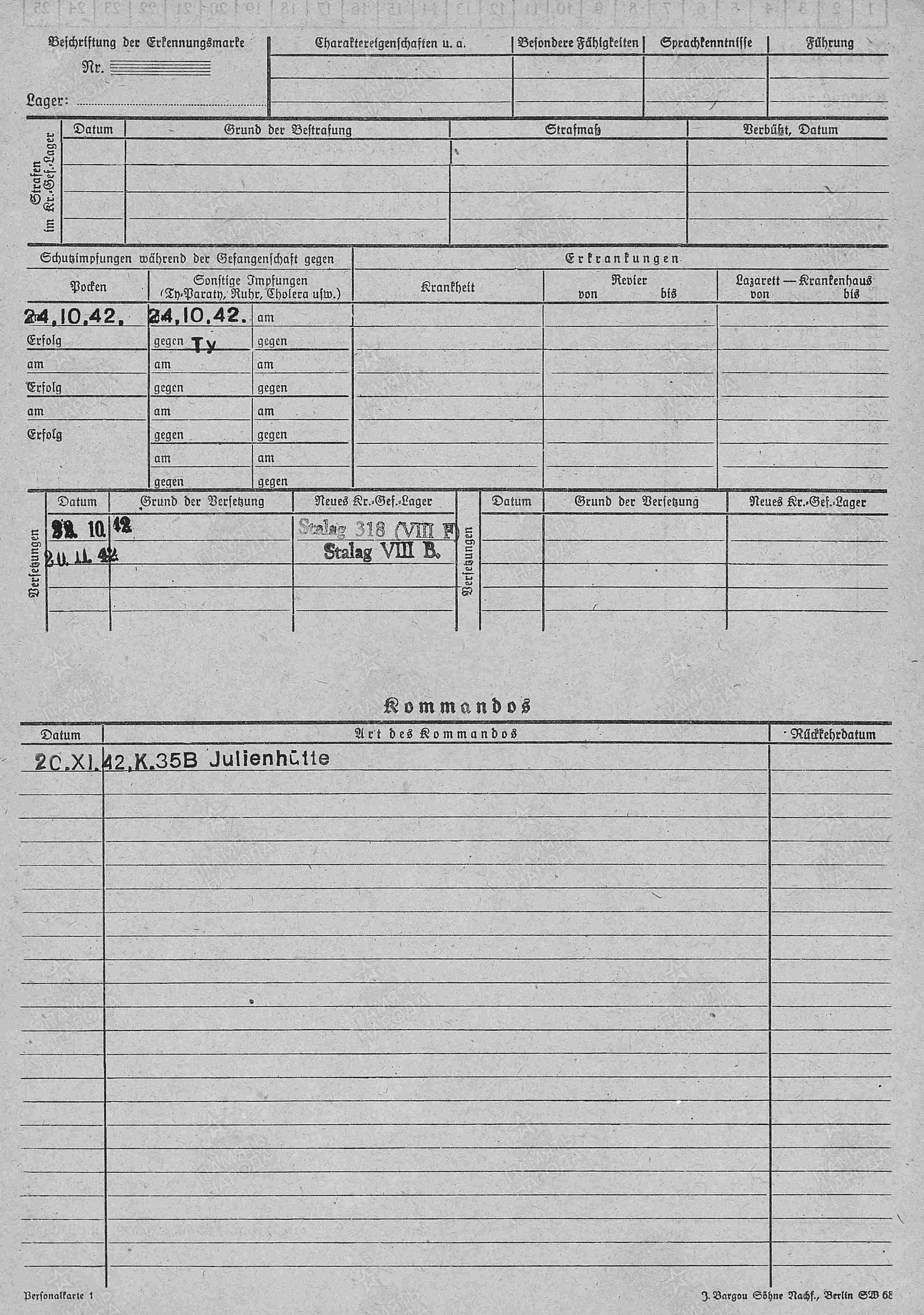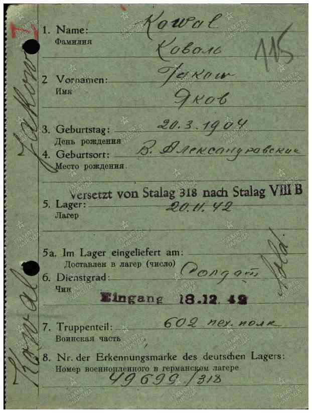 Место заключения: шталаг VIII F (318); шталаг VIII B