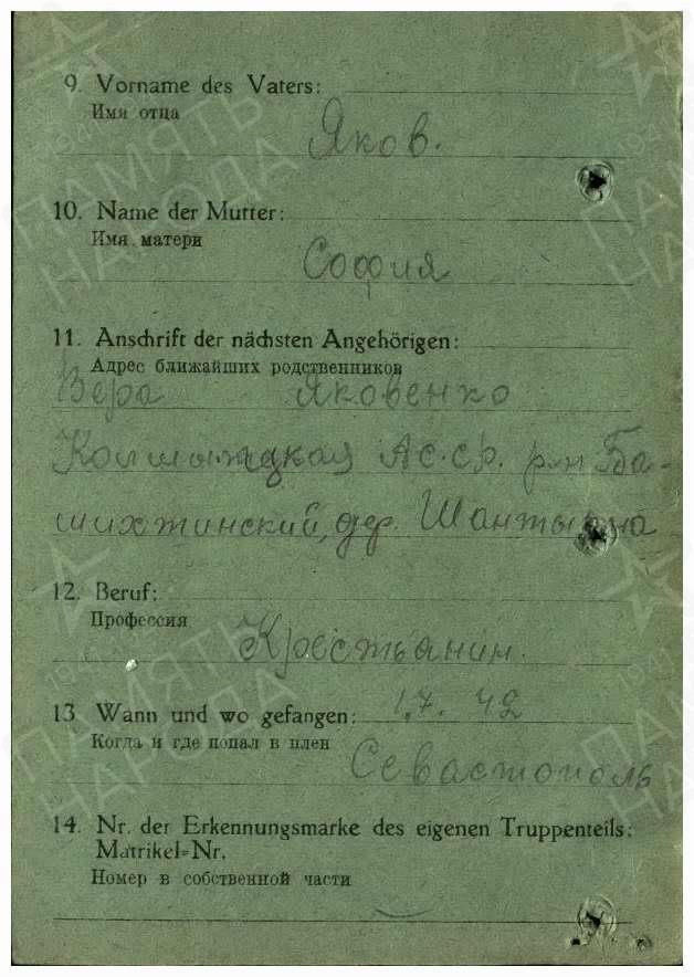 Место заключения: шталаг VI C, шталаг VI K (326), шталаг VI D, шталаг VI A