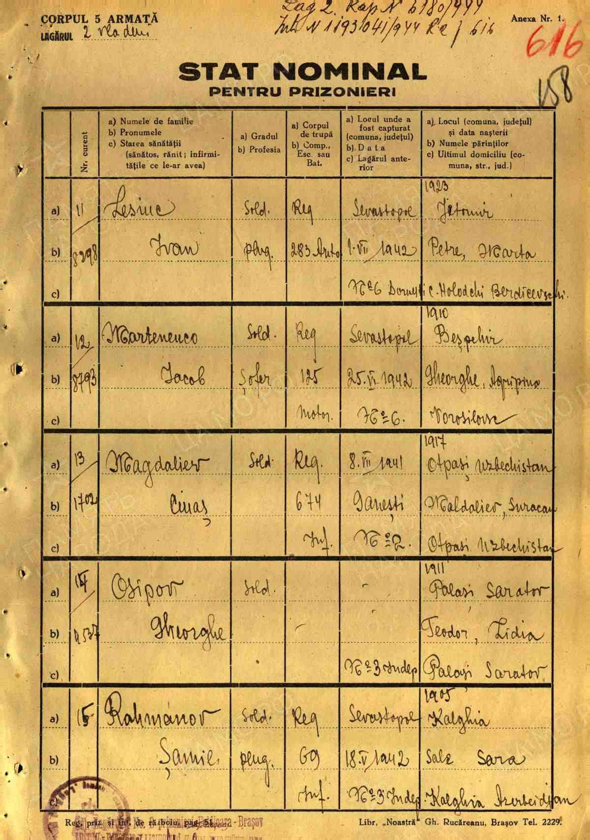 Место заключения: лаг. 2 Фельдиора, Румыния, Брашов уезд