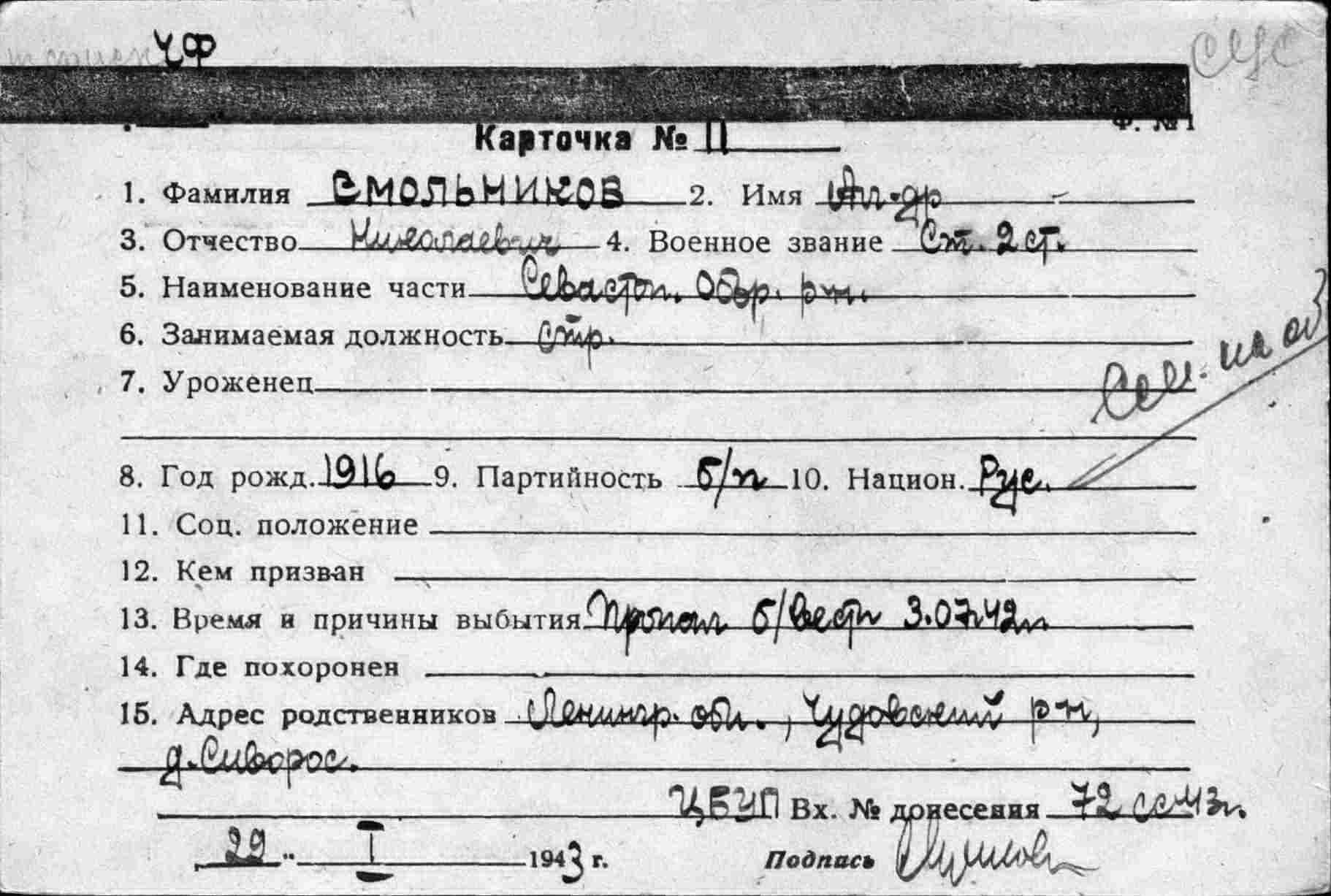 ЦВМА Картотека безвозвратных потерь; ЦВМА документы; Архив ФСБ - Ленинградская область, д.Ящик 1877