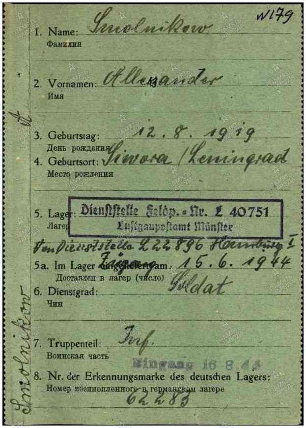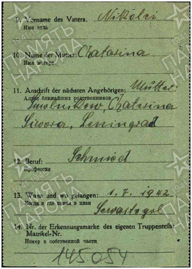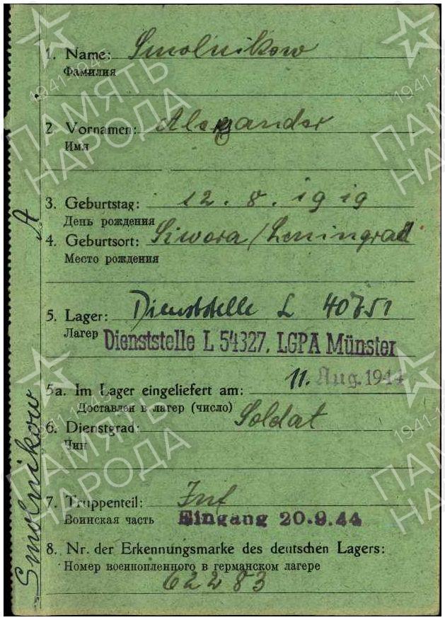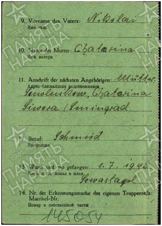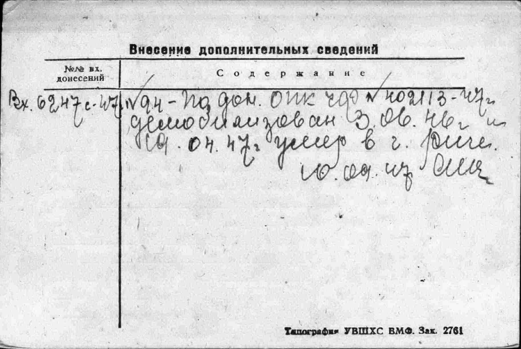 Попал в плен (освобожден). Дата окончания службы: 03.06.1946. Погиб 19.04.1947