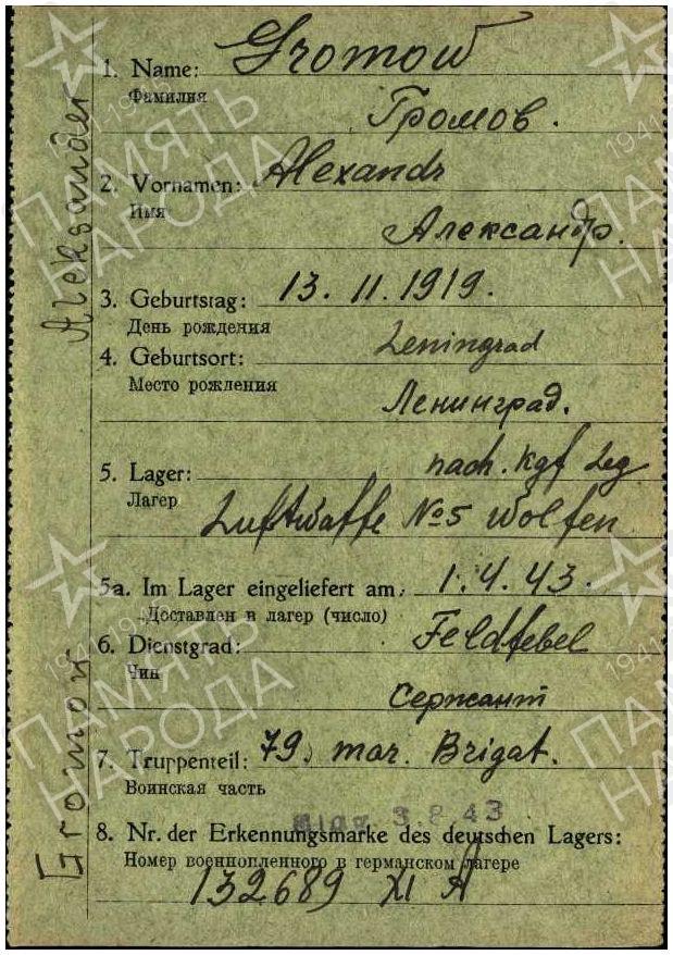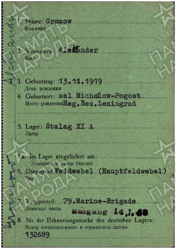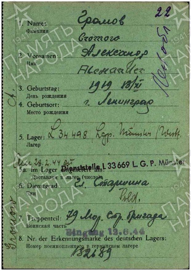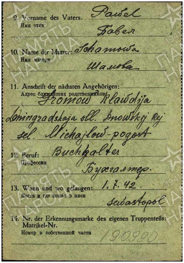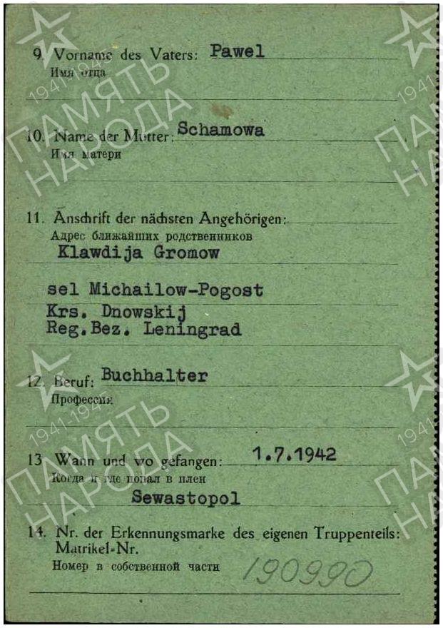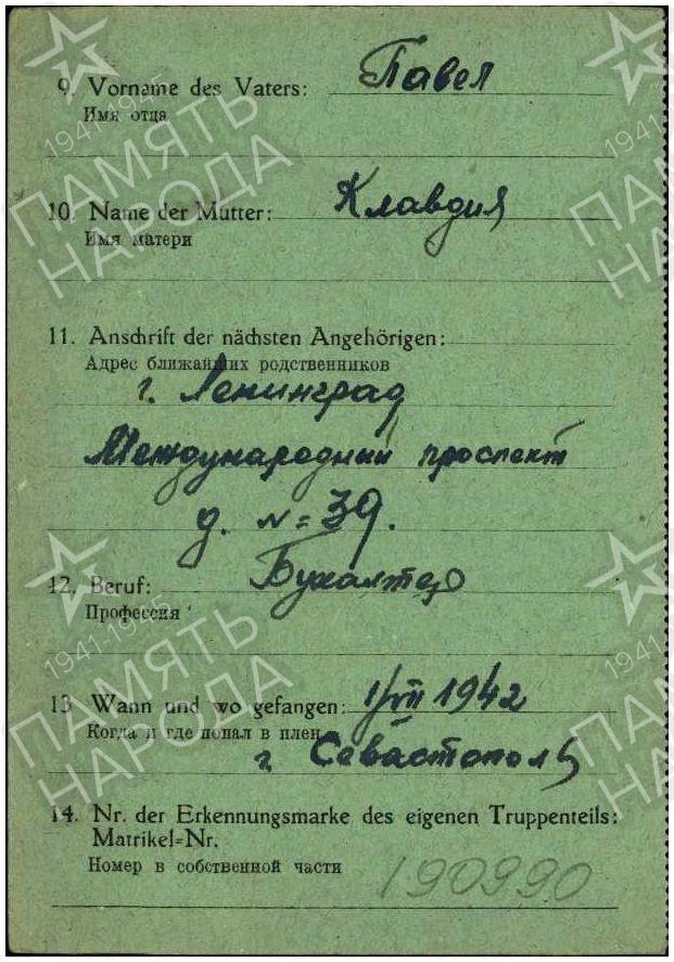 Дополнительно:Место призыва: Дновский РВК, Ленинградская обл., Дновский р-н. Попал в плен (освобожден). Орден Отечественной войны II степени 06.04.1985