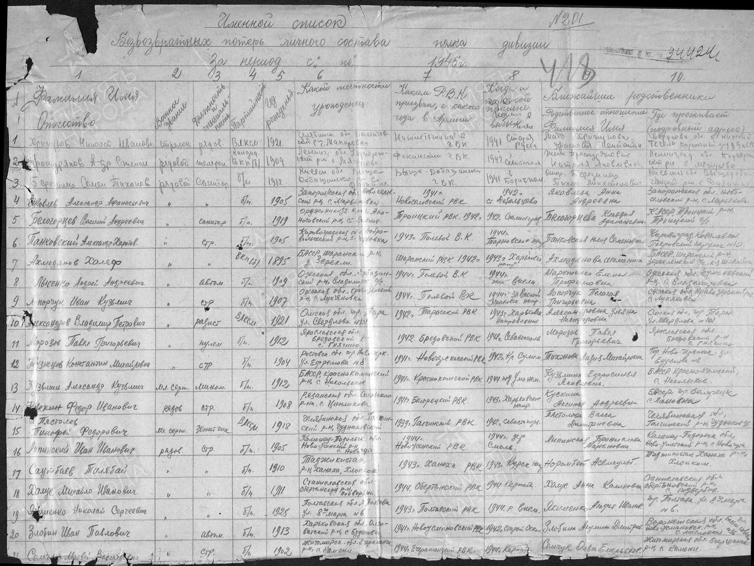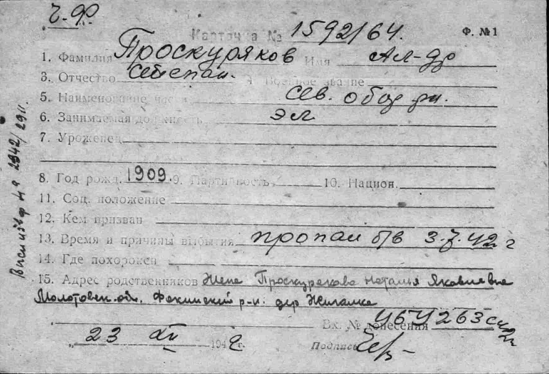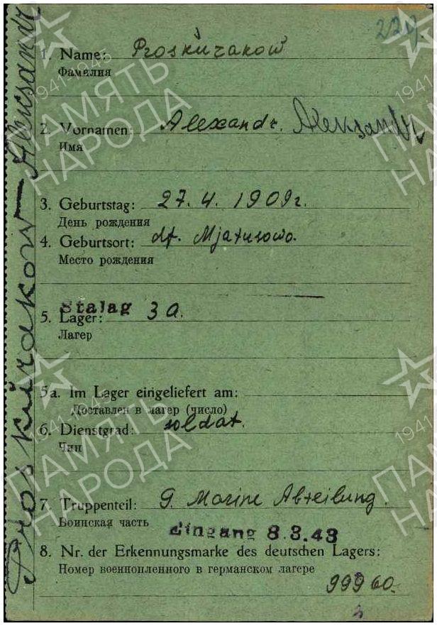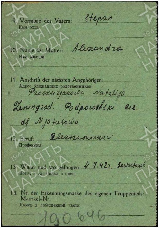 Дополнительно: Место призыва: Фокинский РВК, Молотовская обл., Фокинский р-н. Попал в плен (освобожден). Демобилизован 10.07.1945