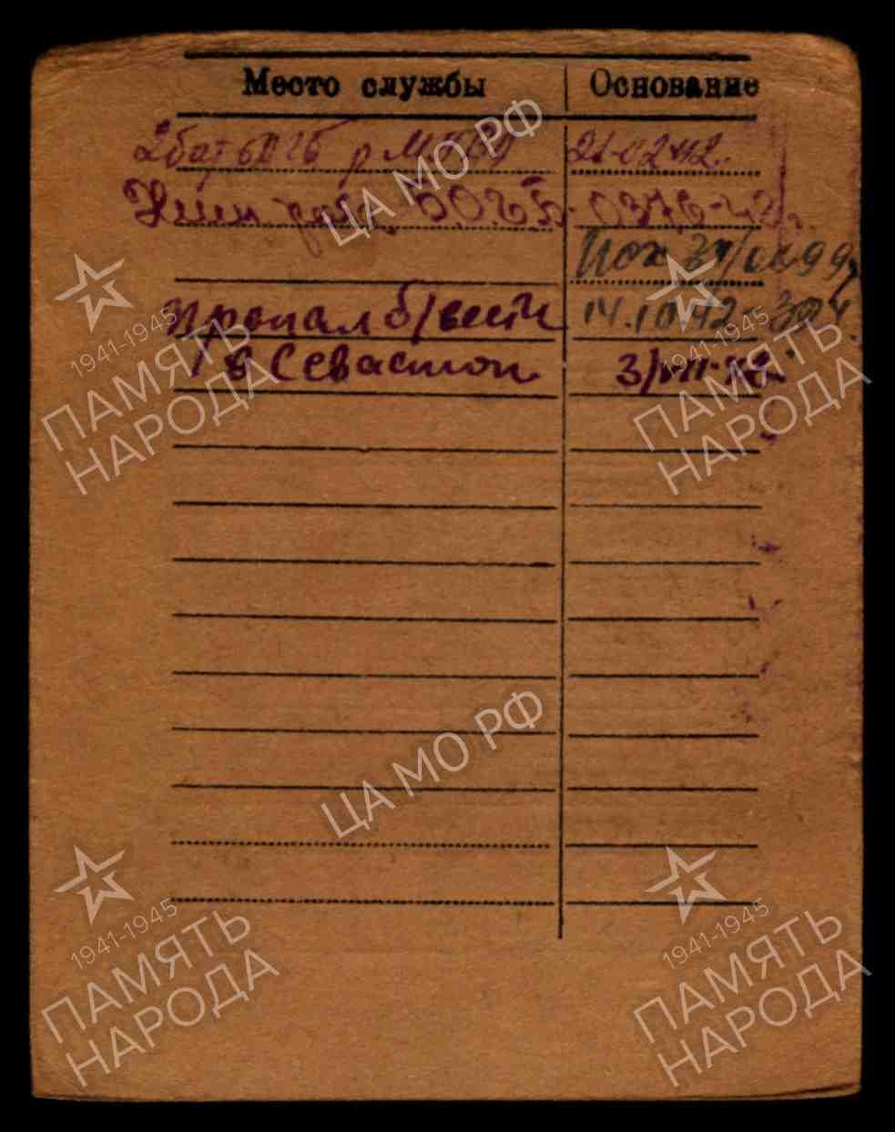 Информация: ЦВМА Картотека безвозвратных потерь; ЦВМА документы; Филиал ЦАМО. Архив Военно-Морского Флота. Хранилище 3, ш.27, я.43; ЦАМО ф.58,о.977521,д.1155; ЦАМО ф.58,о.18003,д.1609; ЦАМО ф.58,о.A-64238,д.21;ЦАМО ф.58,о.А-64238,д.25 Паспорт захоронения