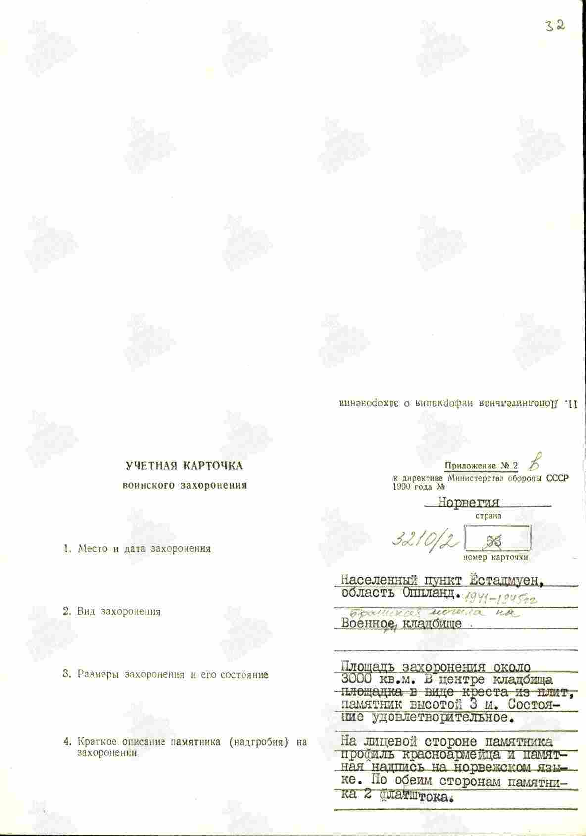 Страна захоронения: Норвегия, Регион захоронения: Оппланд. Место захоронения: н.п. Естадмуен, военное кладбище