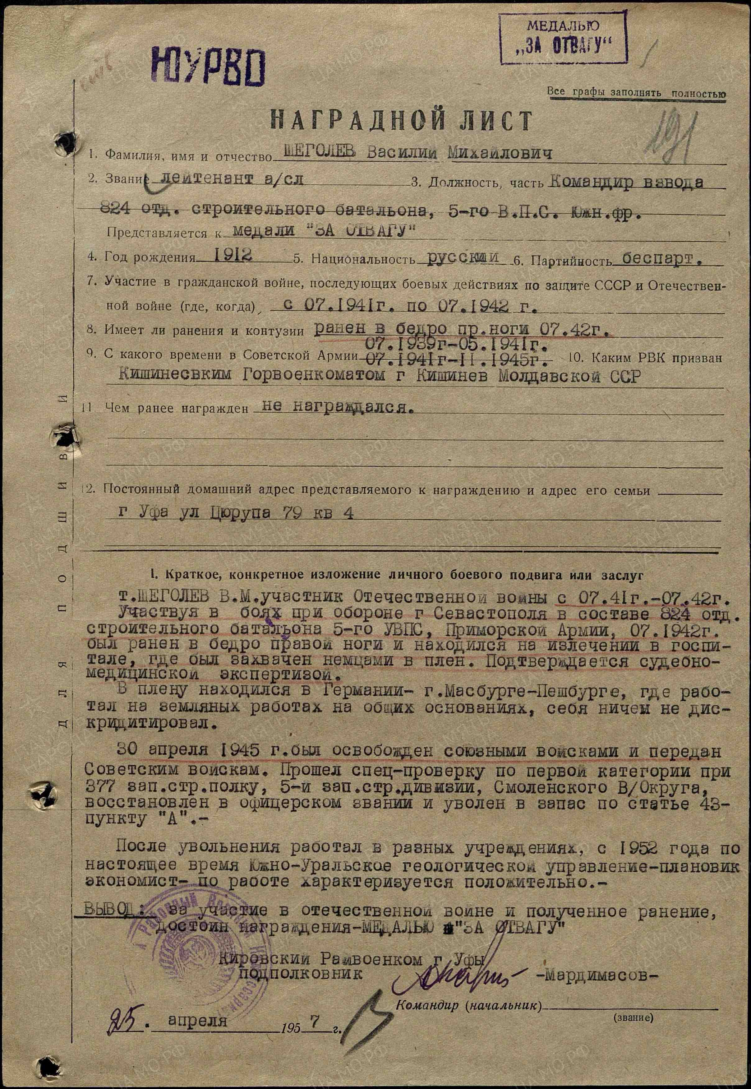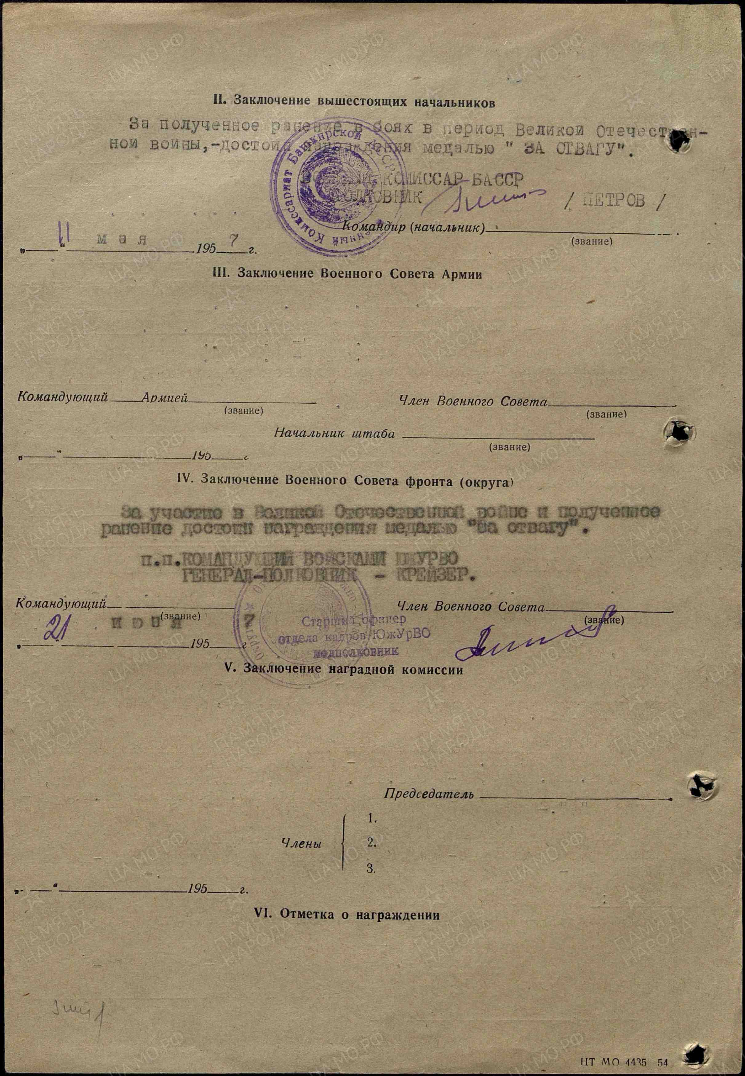 Попал в плен (освобожден). Дата окончания службы: 10.11.1945. Медаль «За отвагу» 07.10.1957