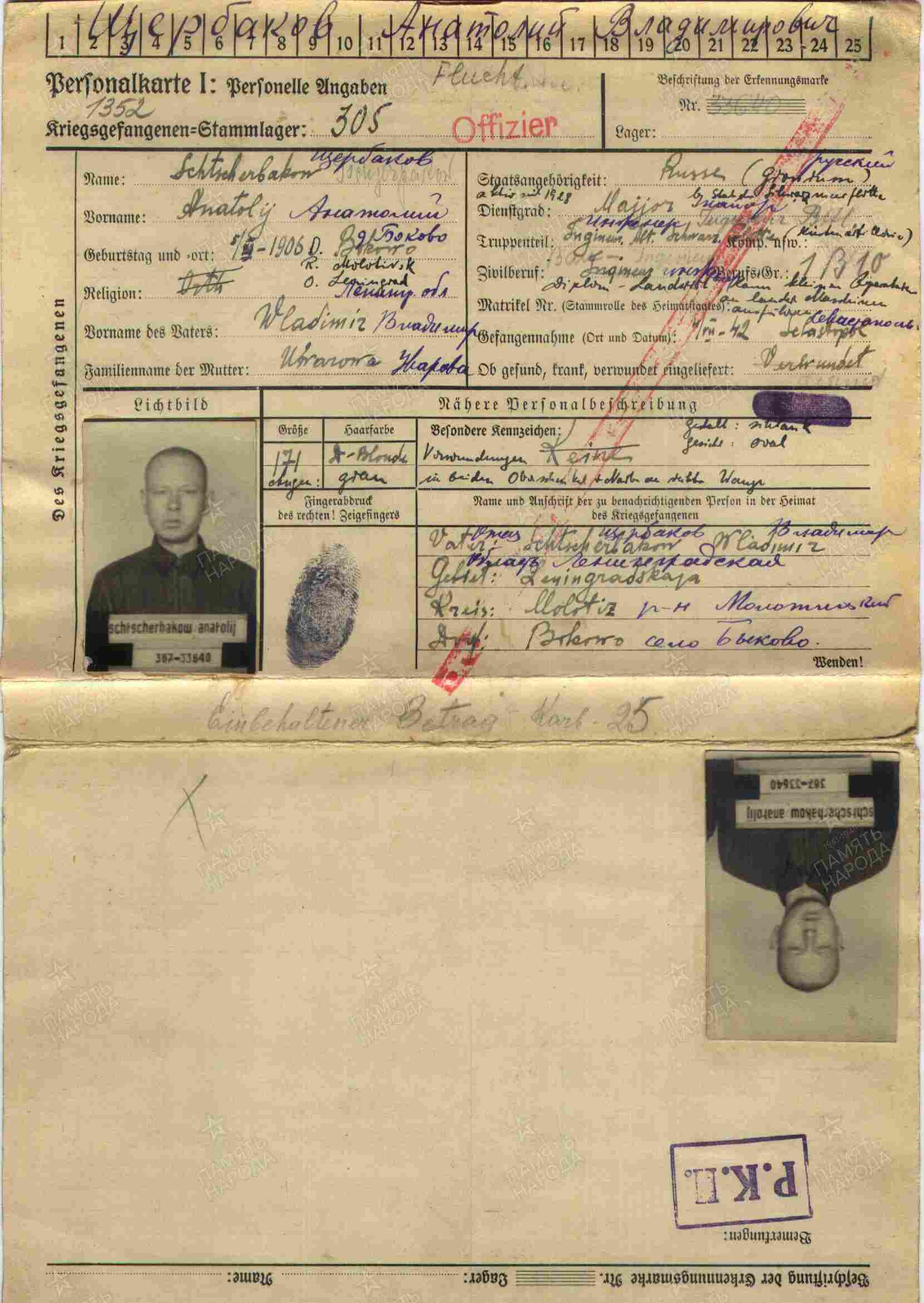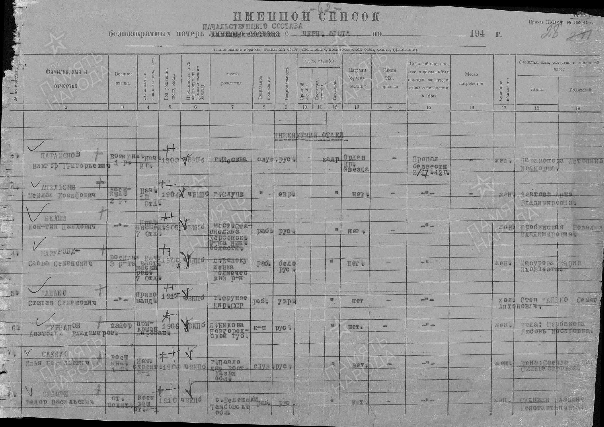 Информация: ЦВМА Картотека безвозвратных потерь; ЦВМА ф.1250,о.3,д.415-А; ЦВМА документы; ЦАМО Картотека военнопленных офицеров