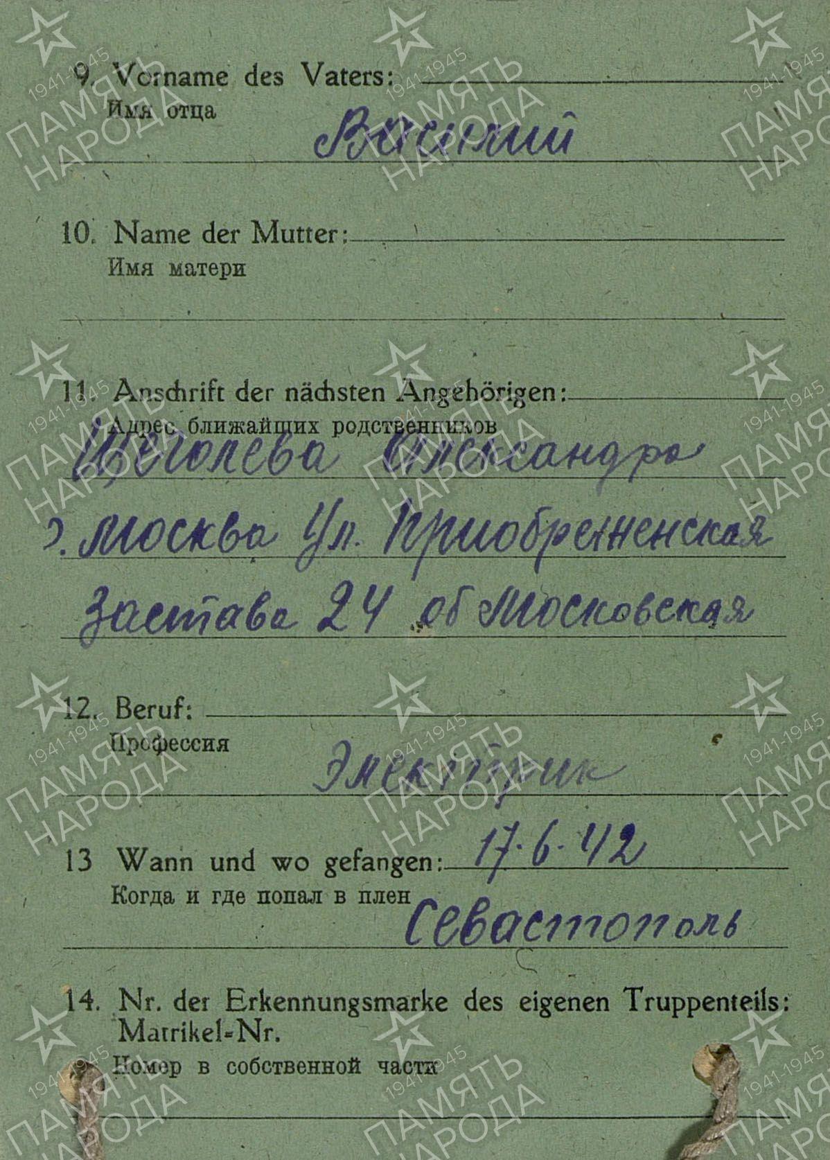 Дополнительно: Дата призыва: 1942 Место призыва: Советский РВК, Московская обл., г. Москва, Советский р-н.