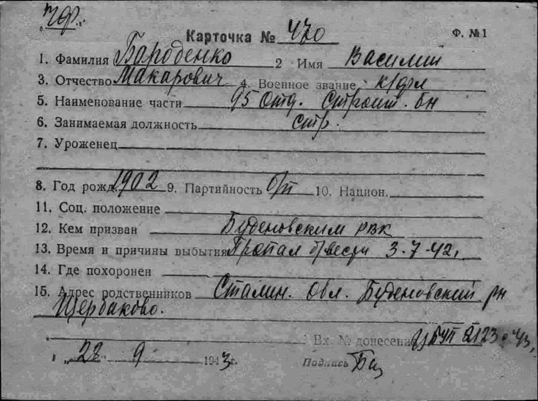 Дополнительно: Место призыва: Буденновский РВК, Украинская ССР, Сталинская обл., Буденновский р-н