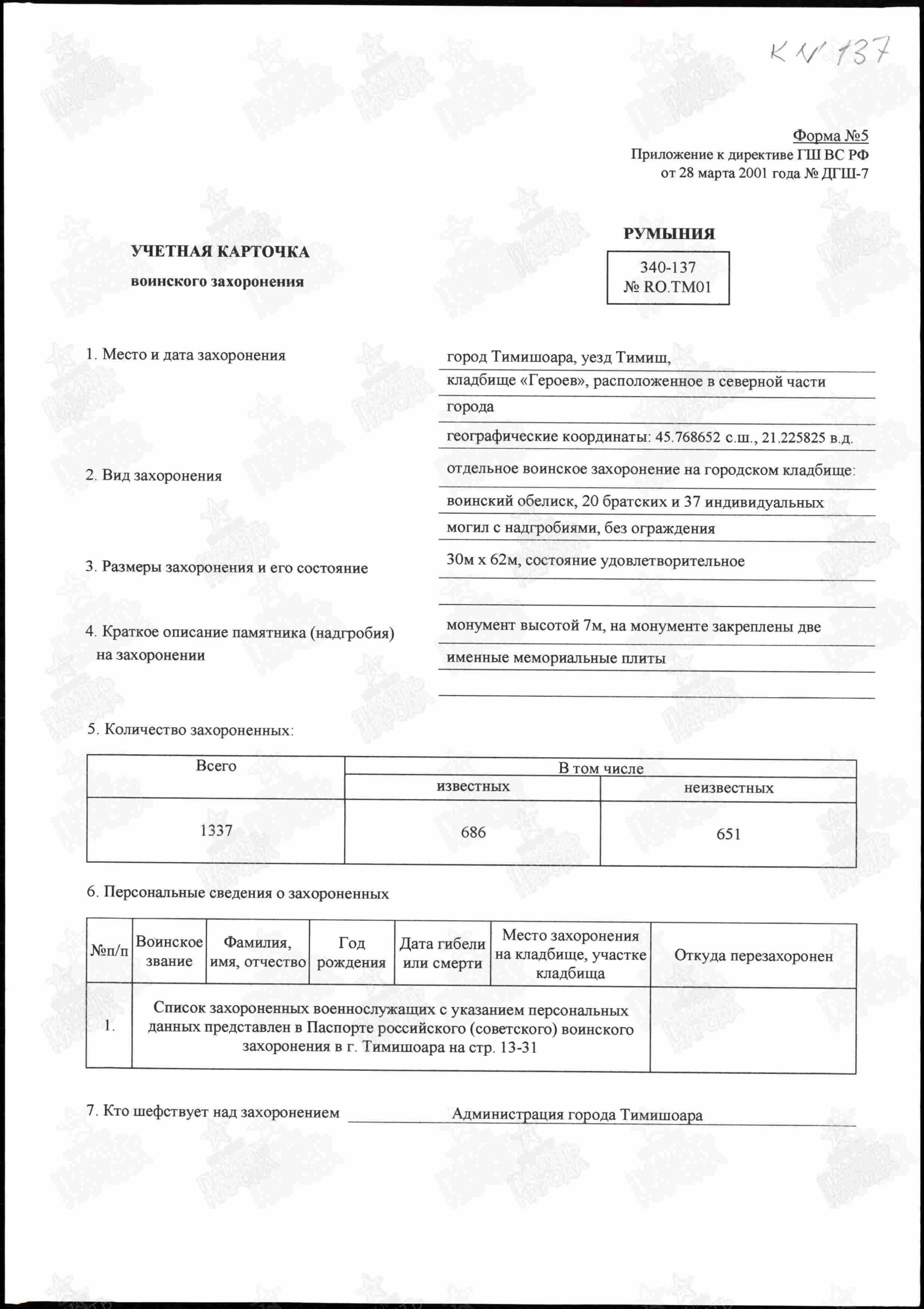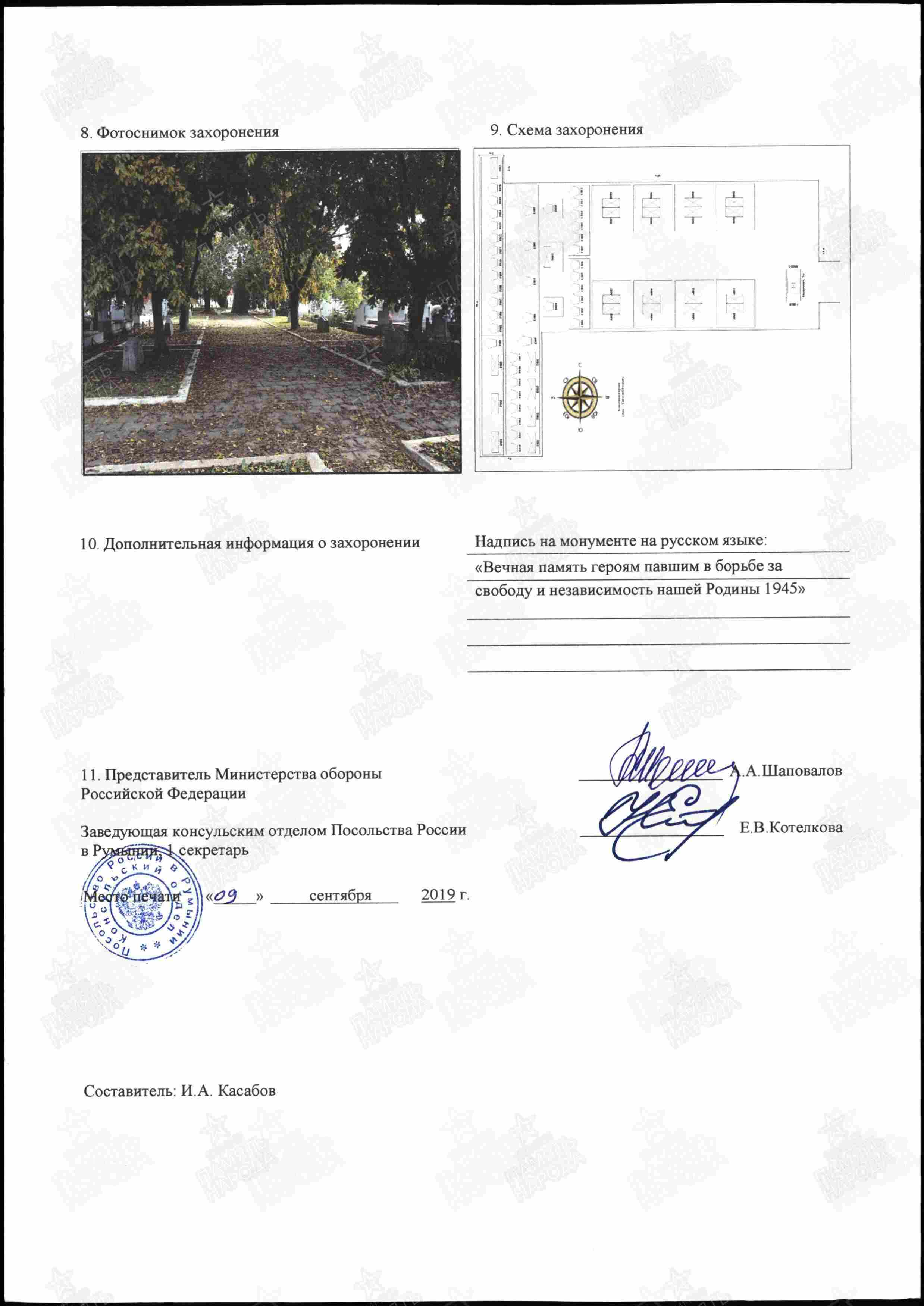Дополнительно: Страна захоронения: Румыния. Регион захоронения: Тимиш уезд. Место захоронения: г. Тимишоара, северная часть, кладбище Героев. Могила: БМ НУВ