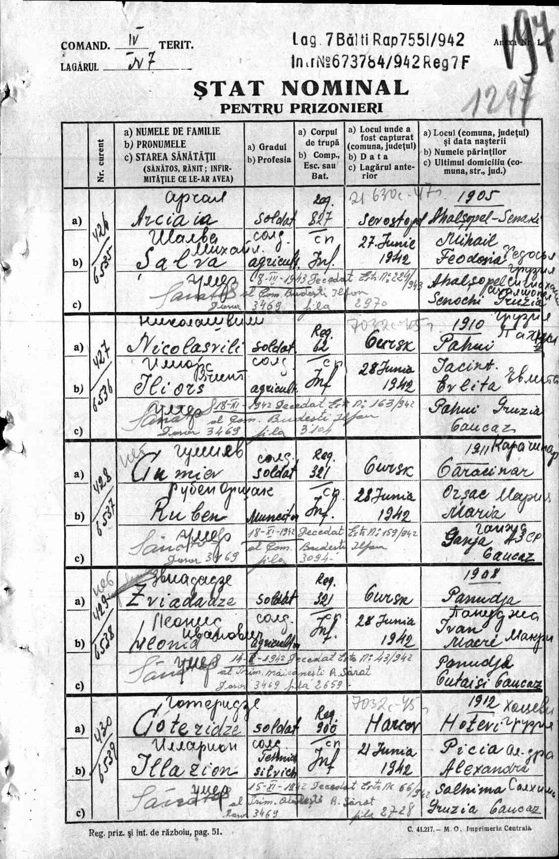 Место заключения: лагерь 7 Бельцы