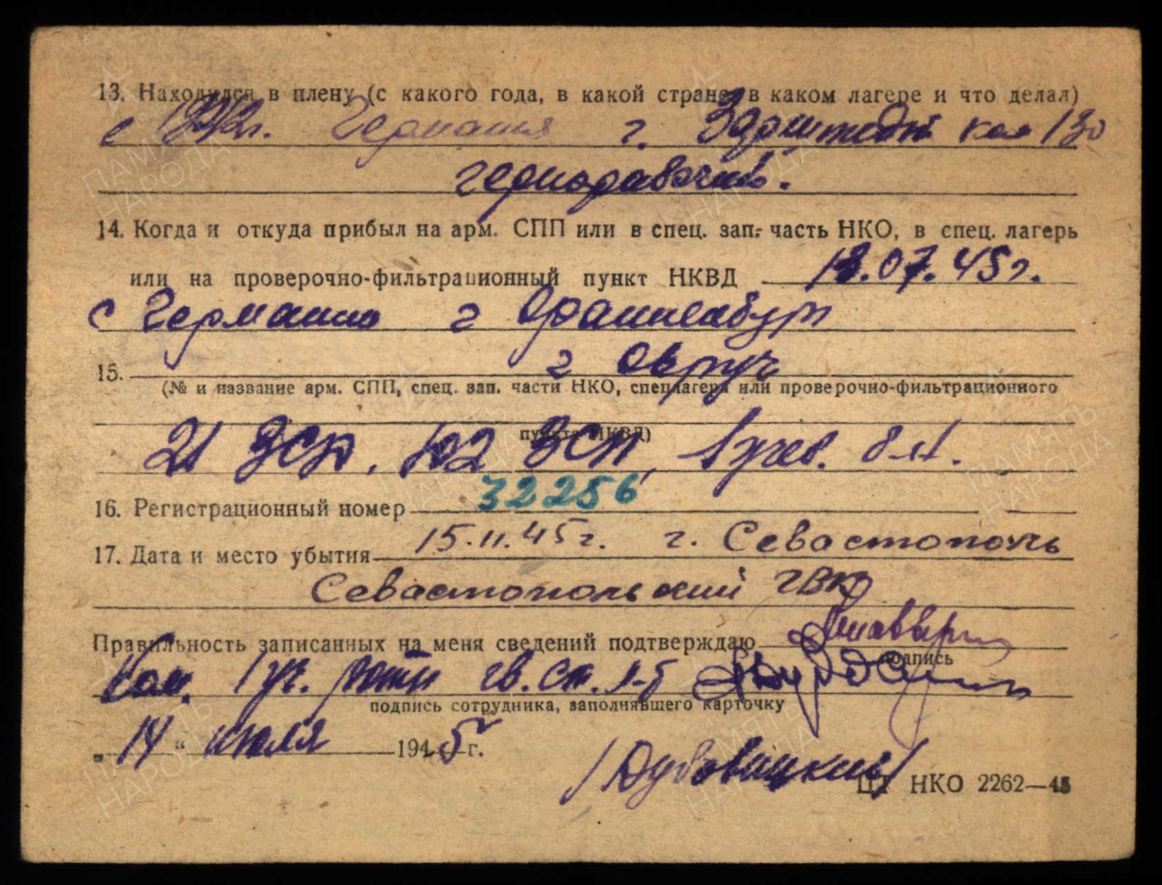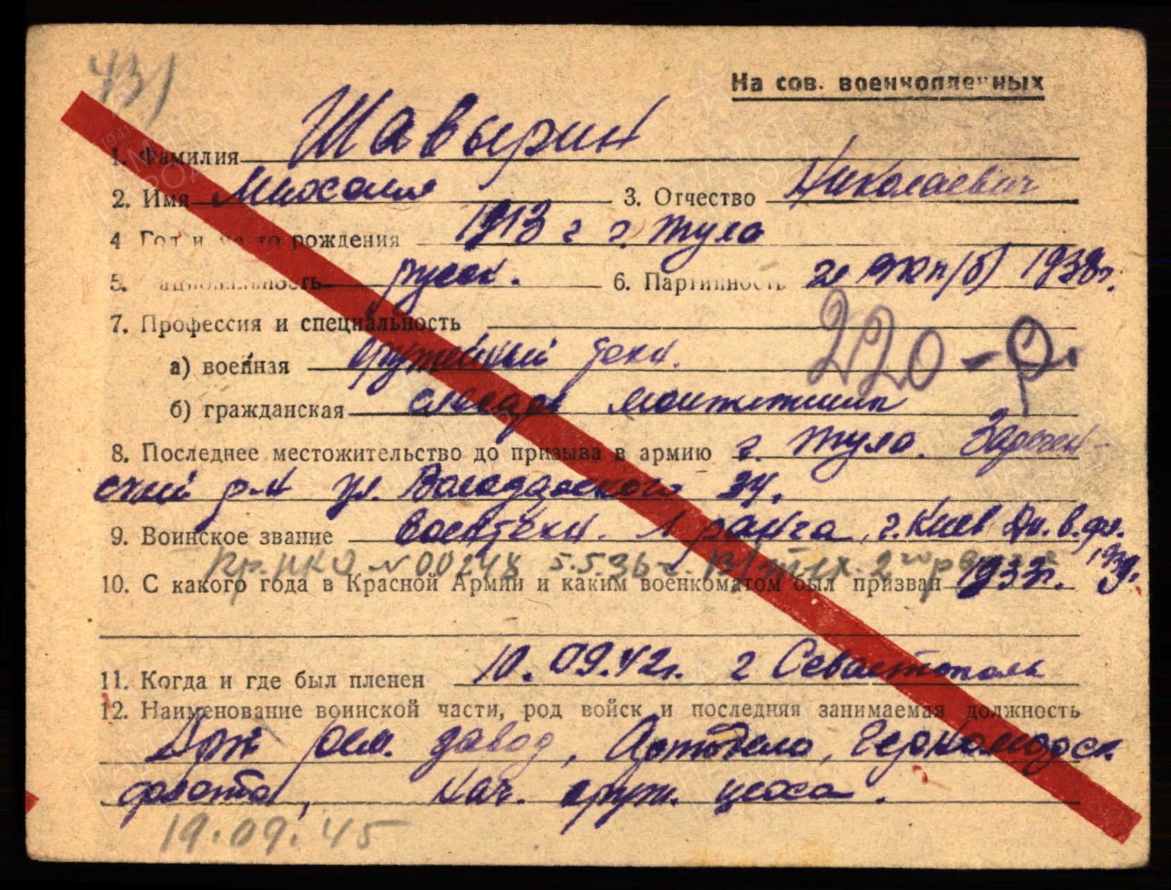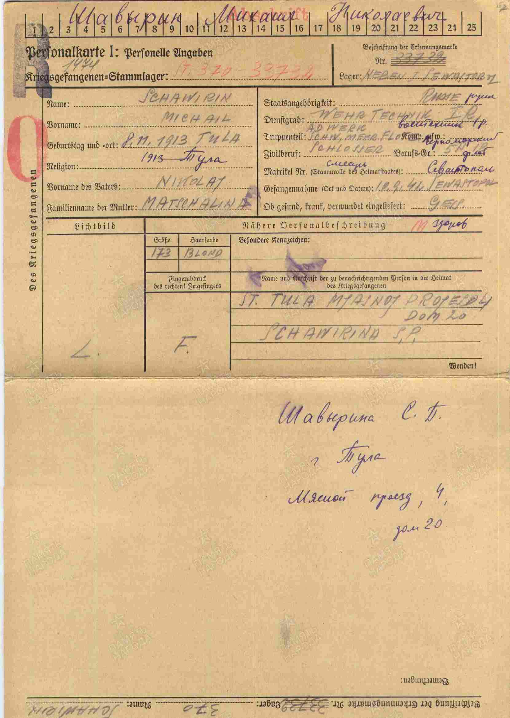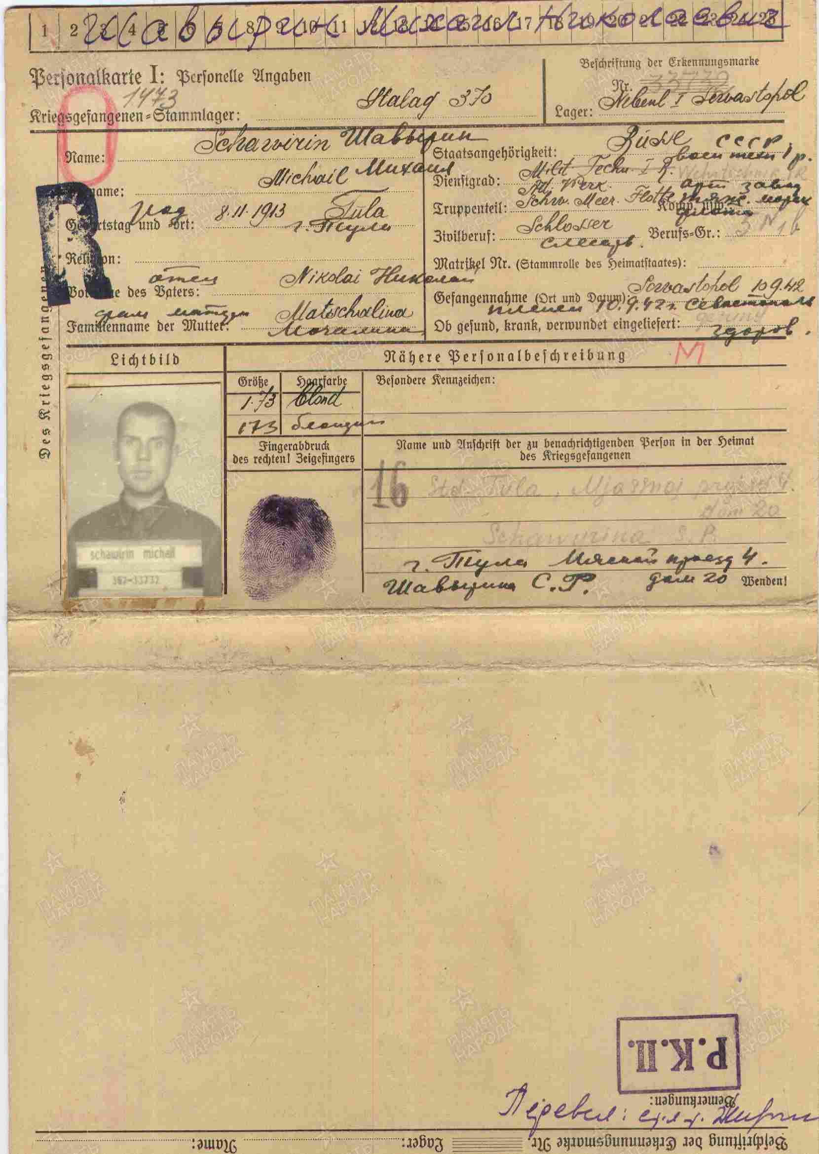 Дата и место пленения: 10.09.1942 Севастополь