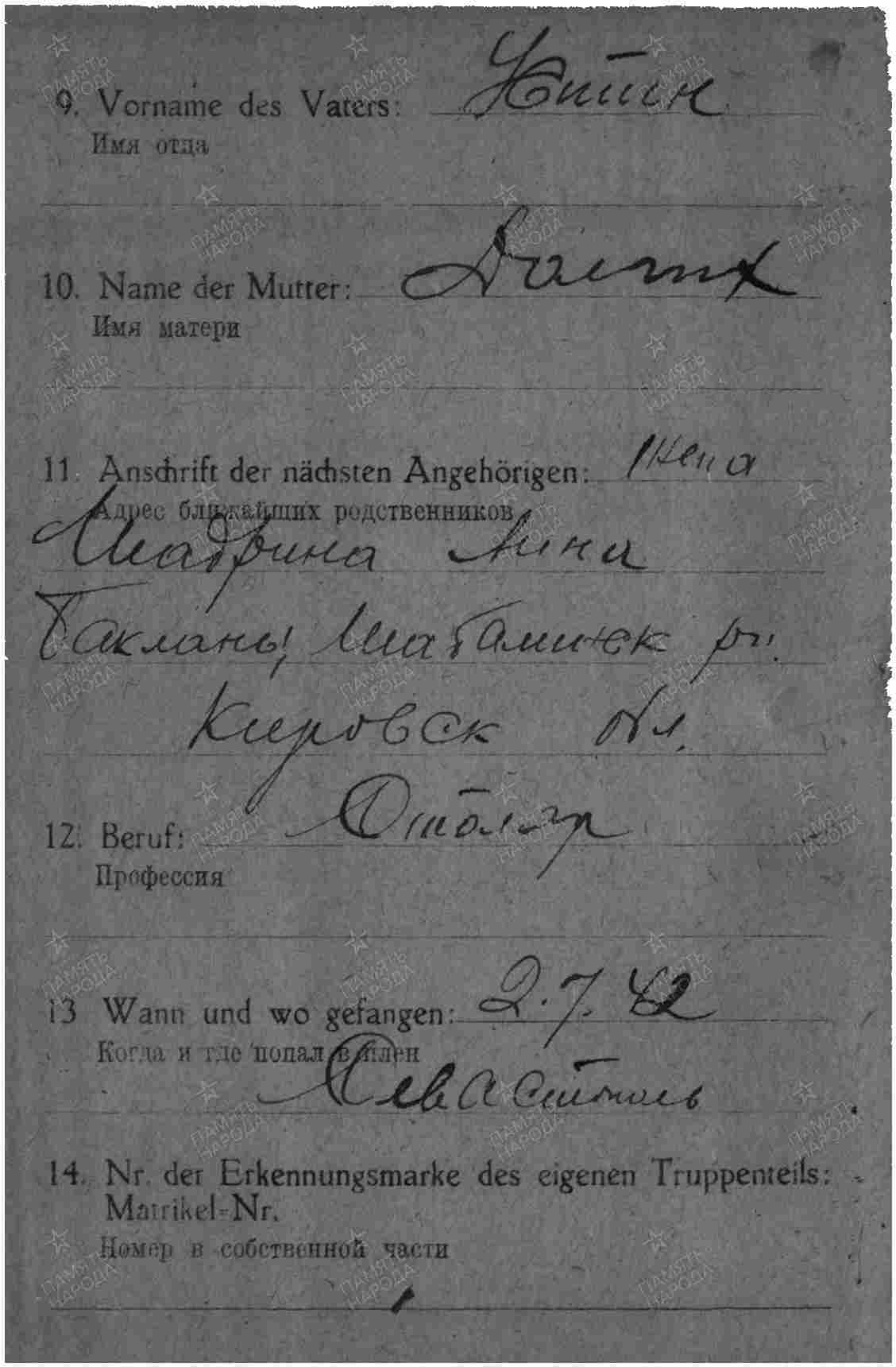 Дата и место пленения: 02.07.1942 Севастополь