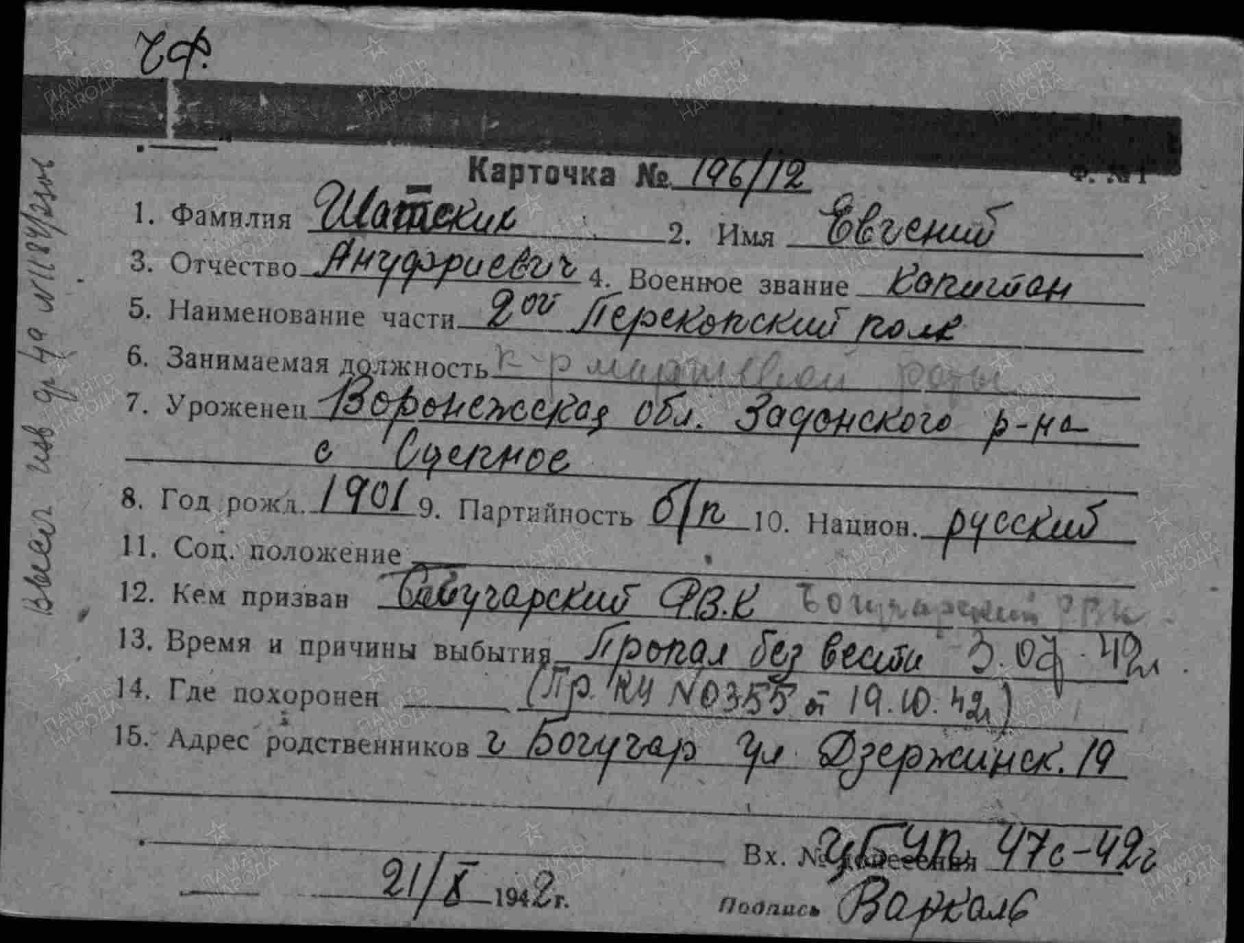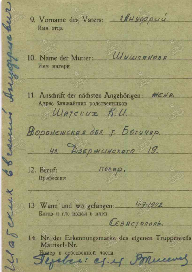 Информация: ЦВМА Картотека безвозвратных потерь; ЦВМА документы; ЦАМО Картотека военнопленных офицеров