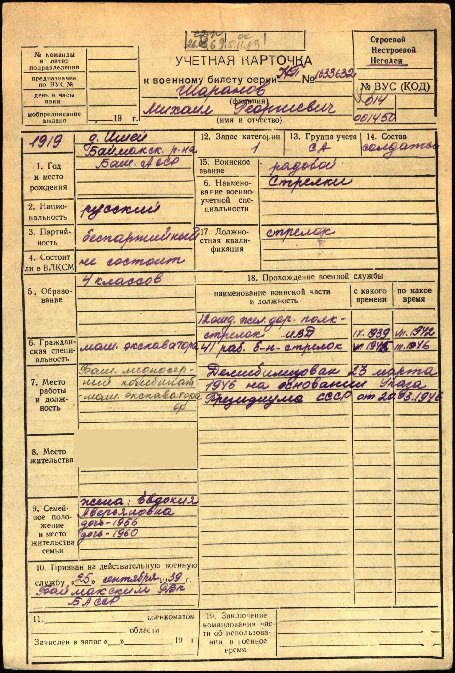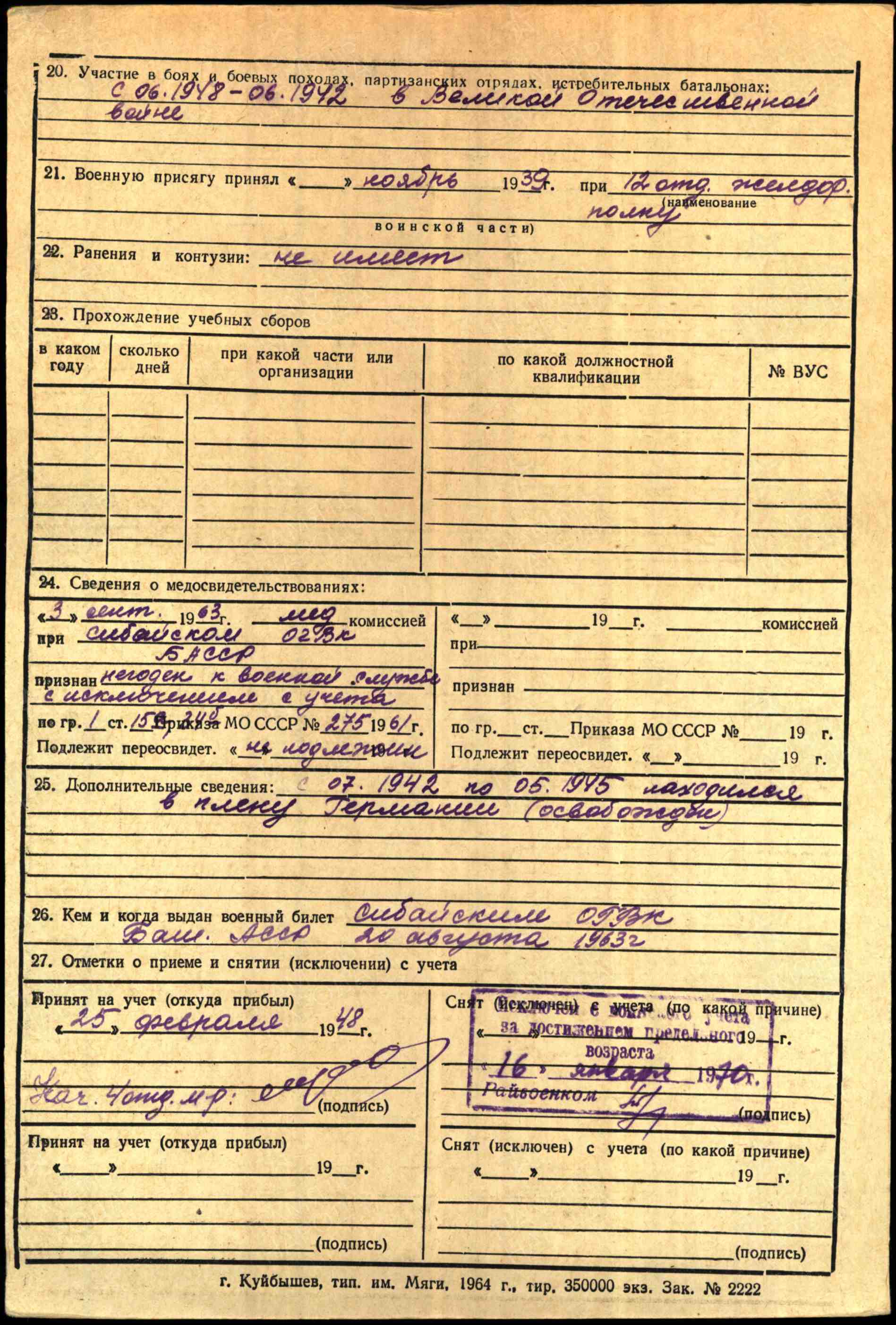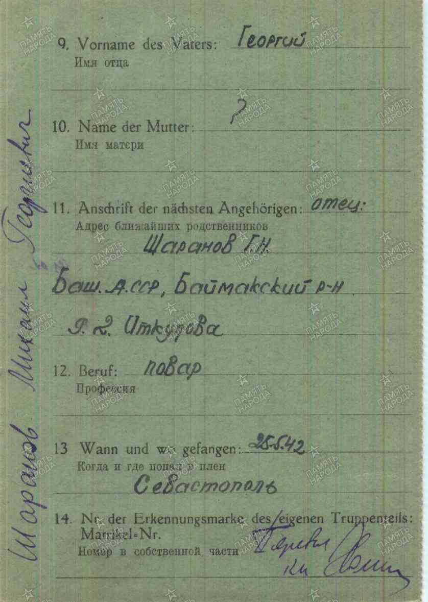 Дополнительно:Дата призыва: 25.09.1939 Место призыва: Баймакский РВК, Башкирская АССР, Баймакский р-н.