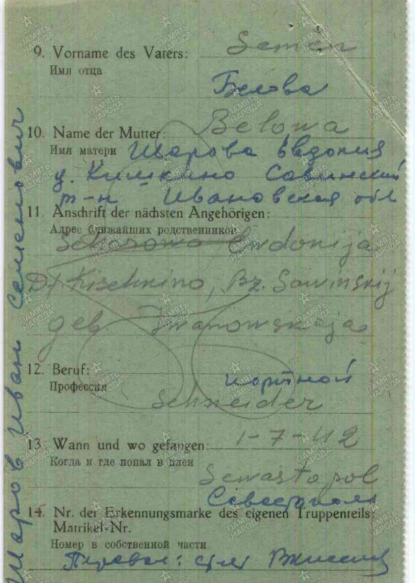 Дополнительно: Дата призыва: 01.10.1937 Место призыва: Шуйский РВК, Ивановская обл., Шуйский р-н.