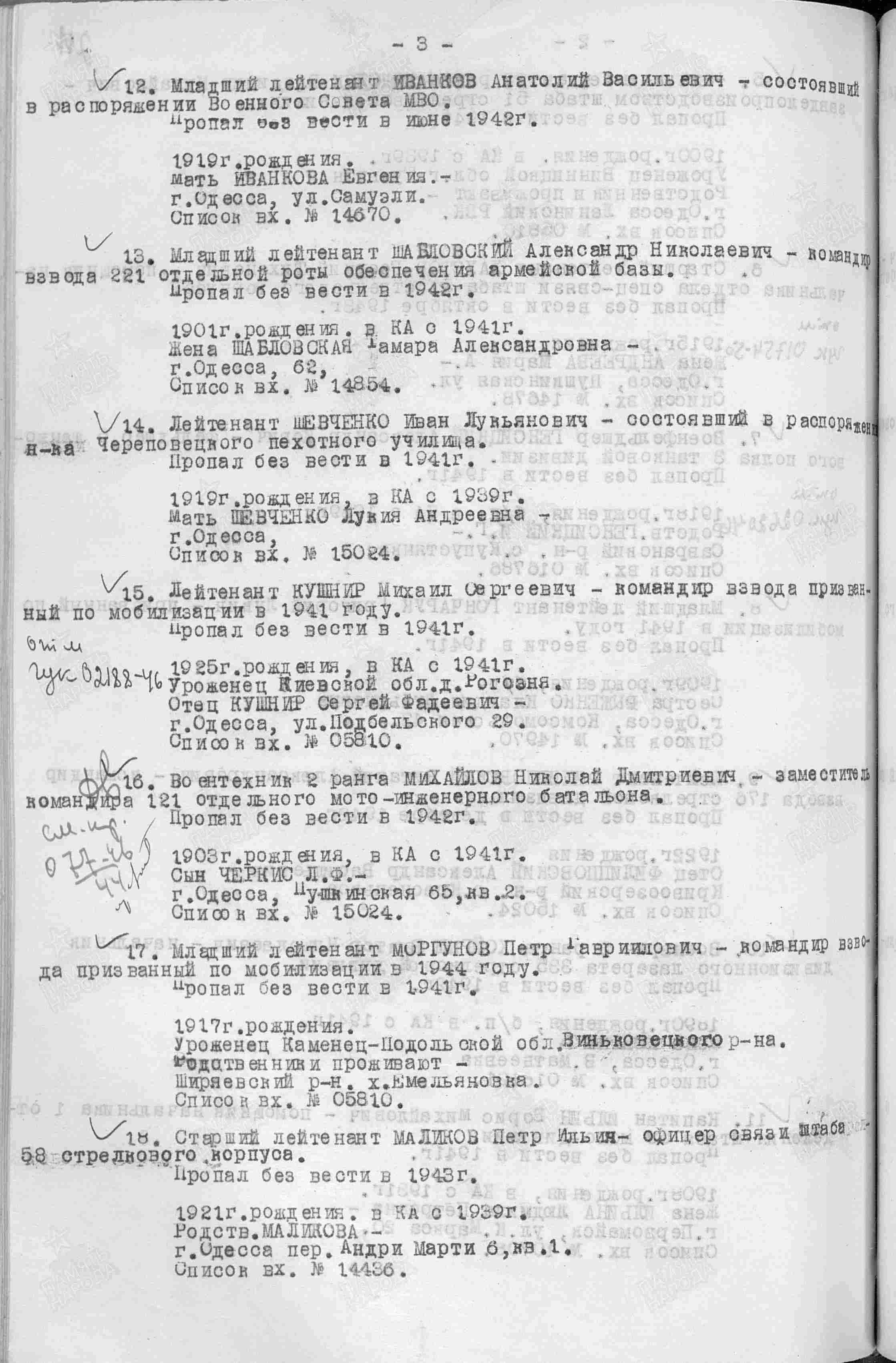 ЦАМО ф.33,о.744825,д.14; ЦАМО ф.33,о.563783,д.14; ЦАМО Картотека военнопленных офицеров