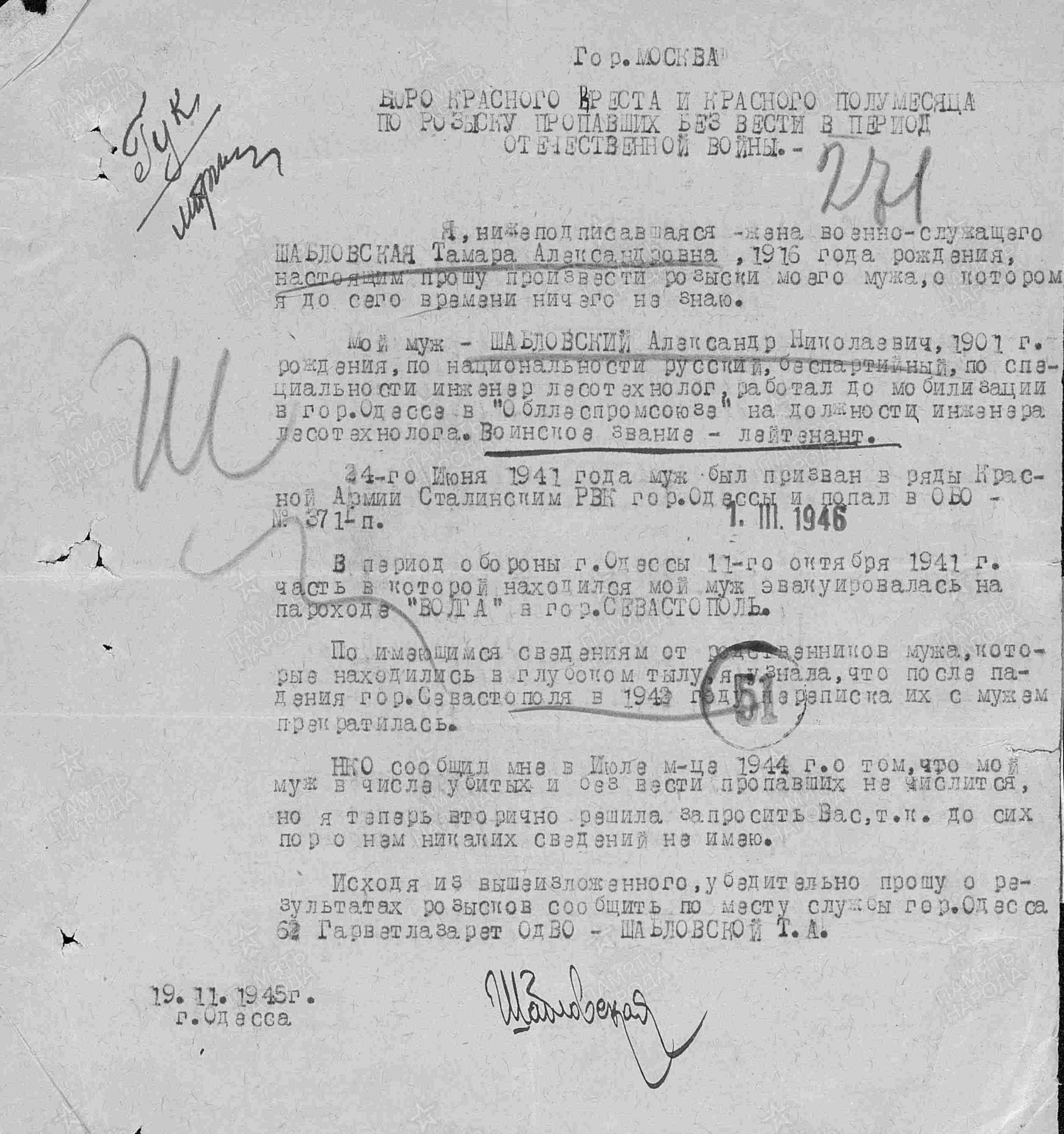 Дата призыва: 24.06.1941 Место призыва: Сталинский РВК, Украинская ССР, г. Одесса, Сталинский р-н