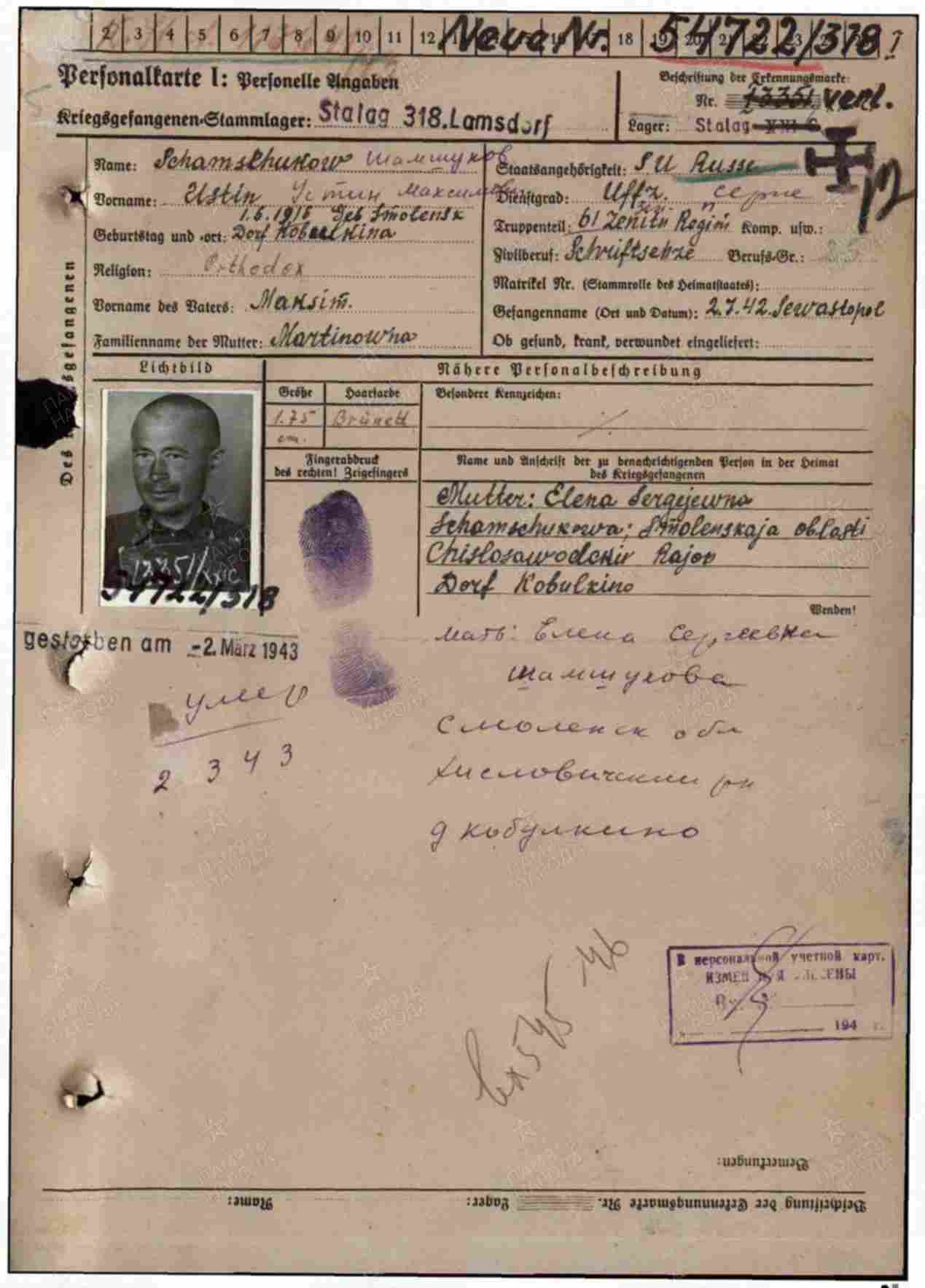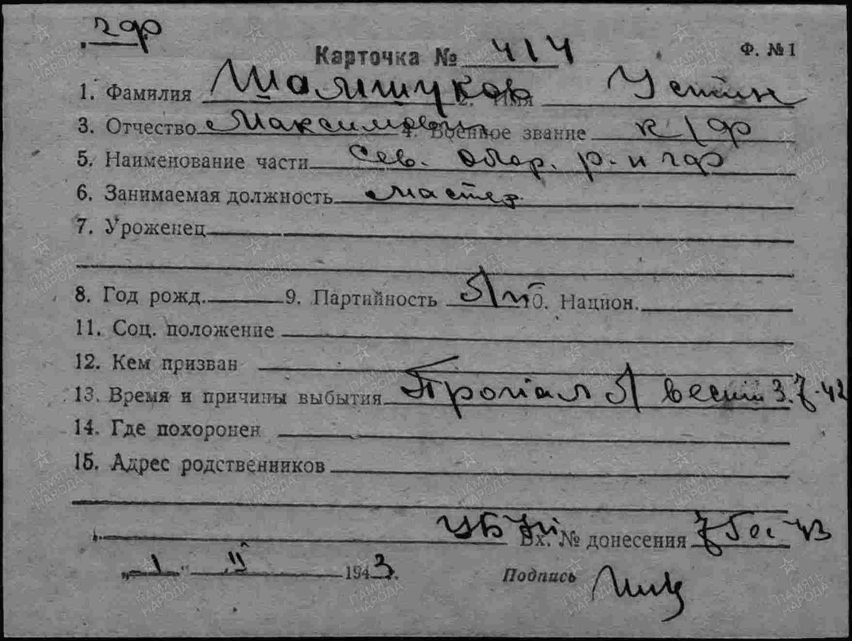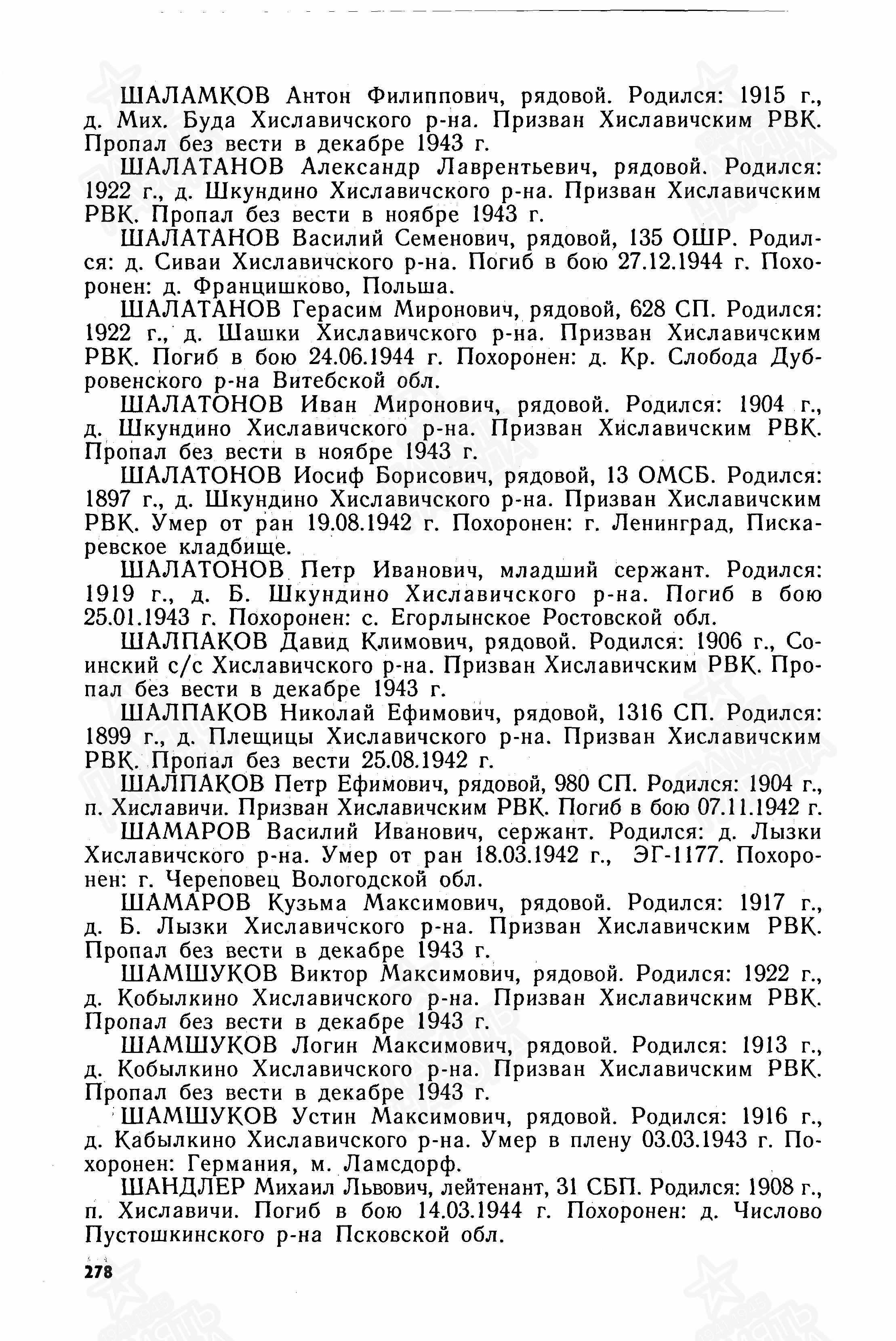 ЦВМА Картотека безвозвратных потерь; ЦВМА документы; ЦАМО ф.58,о.977521,д.977; Книга памяти. Смоленская область. Хиславичский район, Шумячский район