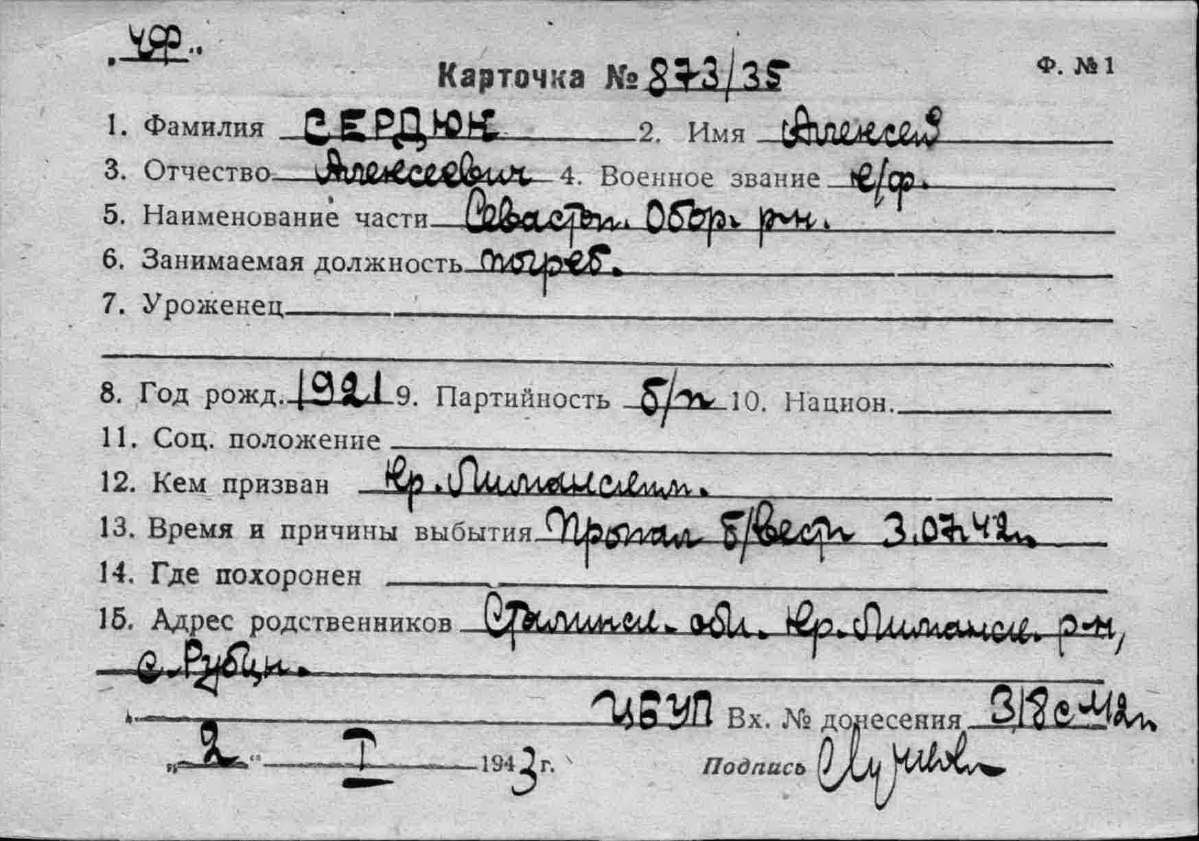 ЦВМА Картотека безвозвратных потерь; ЦВМА документы; Филиал ЦАМО (архив ВМФ) ф.Послужная картотека моряков, о.31,д.6; ЦАМО ф.58,о.977520,д.1771