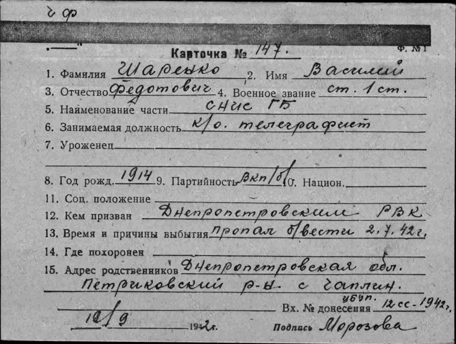 Дополнительно: Дата призыва: 1937 Место призыва: Днепропетровский РВК, Украинская ССР, Днепропетровская обл., Днепропетровский р-н.