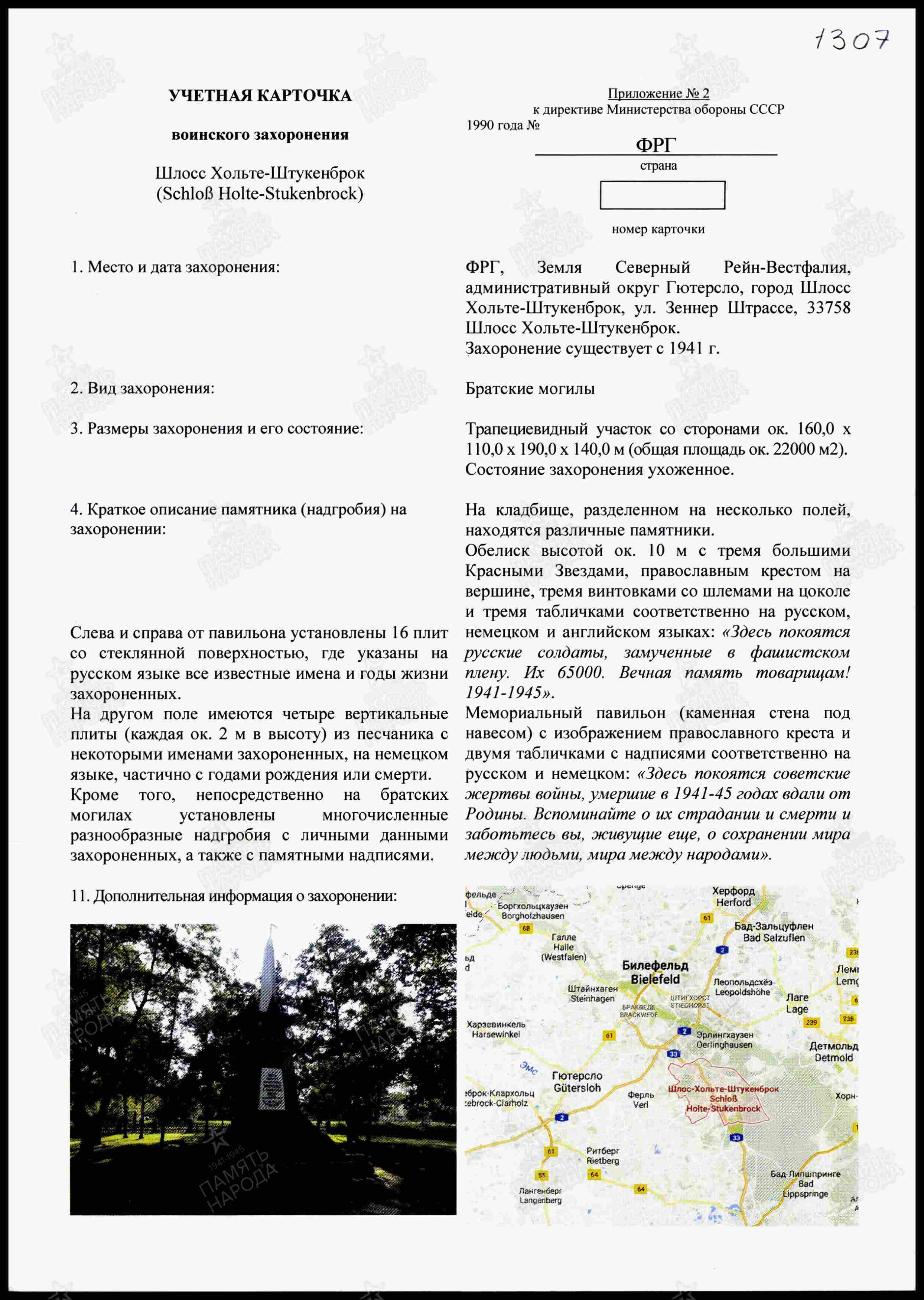 Страна захоронения ФРГ. Регион захоронения Земля Северный Рейн-Вестфалия. Место захоронения административный округ Гютерсло, г. Шлосс Хольте-Штукенброк, 33758, ул. Зеннер Штрассе