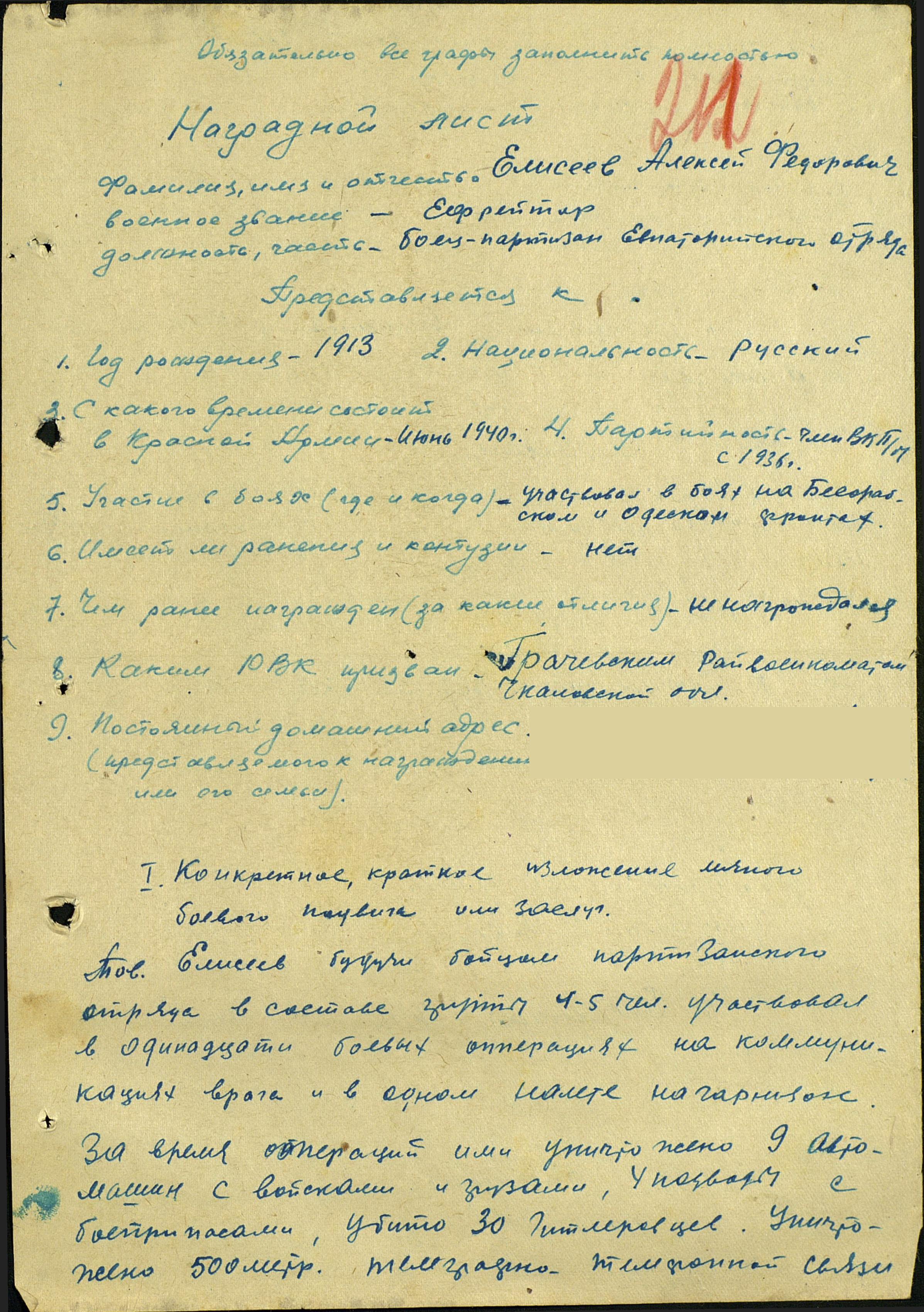 Из наградного листа: в Красной Армии с июня 1940г., член ВКП (б) с 1936г. Участник боев на Бессарабском и Одесском фронтах. Тов. Елисеев будучи бойцом партизанского отряда в составе группы 4-5 человек участвовал в 11 больших операциях на коммуникациях врага и одном налете на гарнизон врага. За время операций им лично уничтожено 9 автомашин с войсками и грузами, 4 подводы с боеприпасами, убито 30 гитлеровцев, уничтожено 500 метров телефонно- телеграфной связи на центральной магистрали. Тов. Елисеев при выполнении боевых операций проявил храбрость и отвагу.
