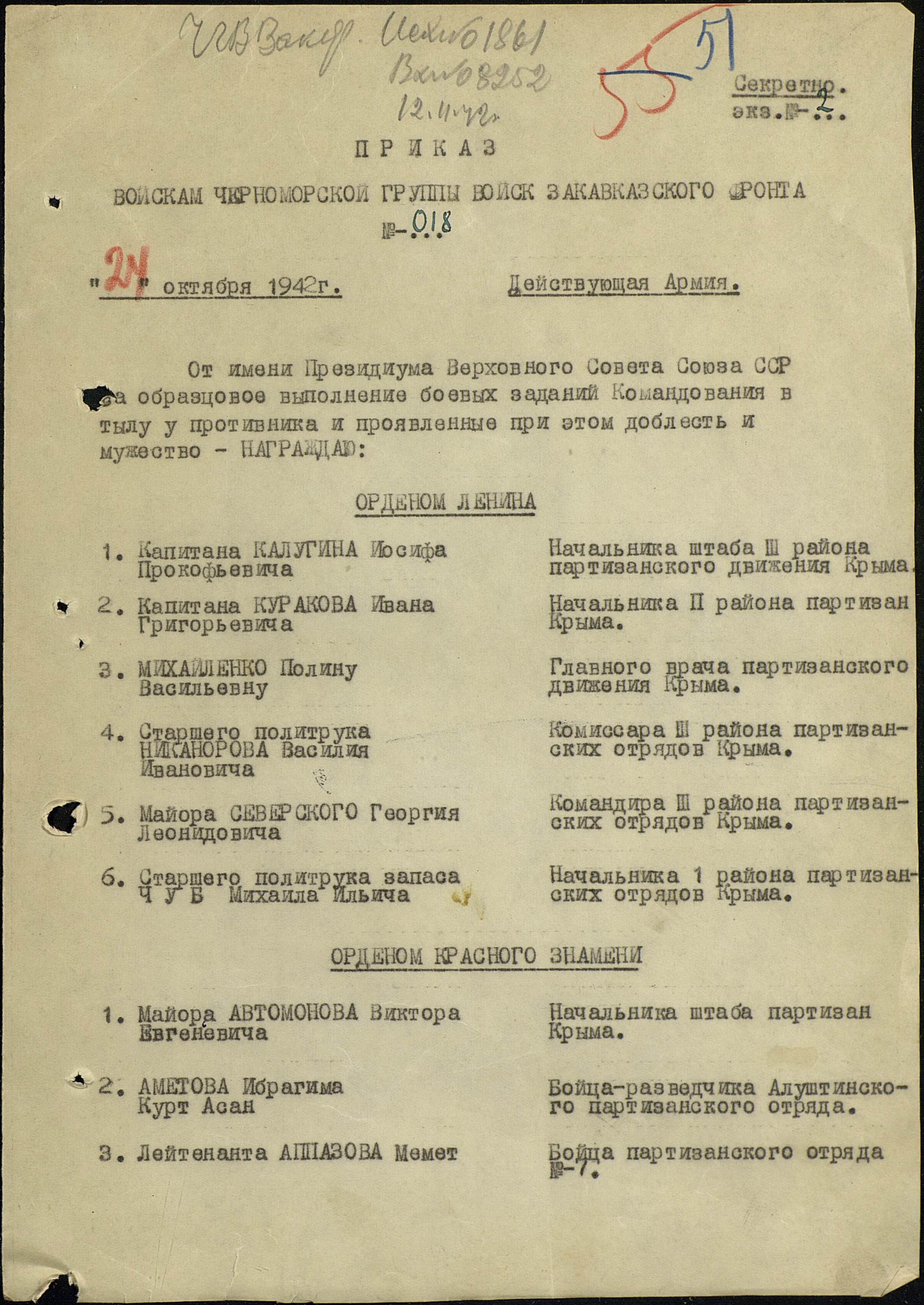 В ноябре 1941 года вступил в ряды Алуштинского партизанского отряда.