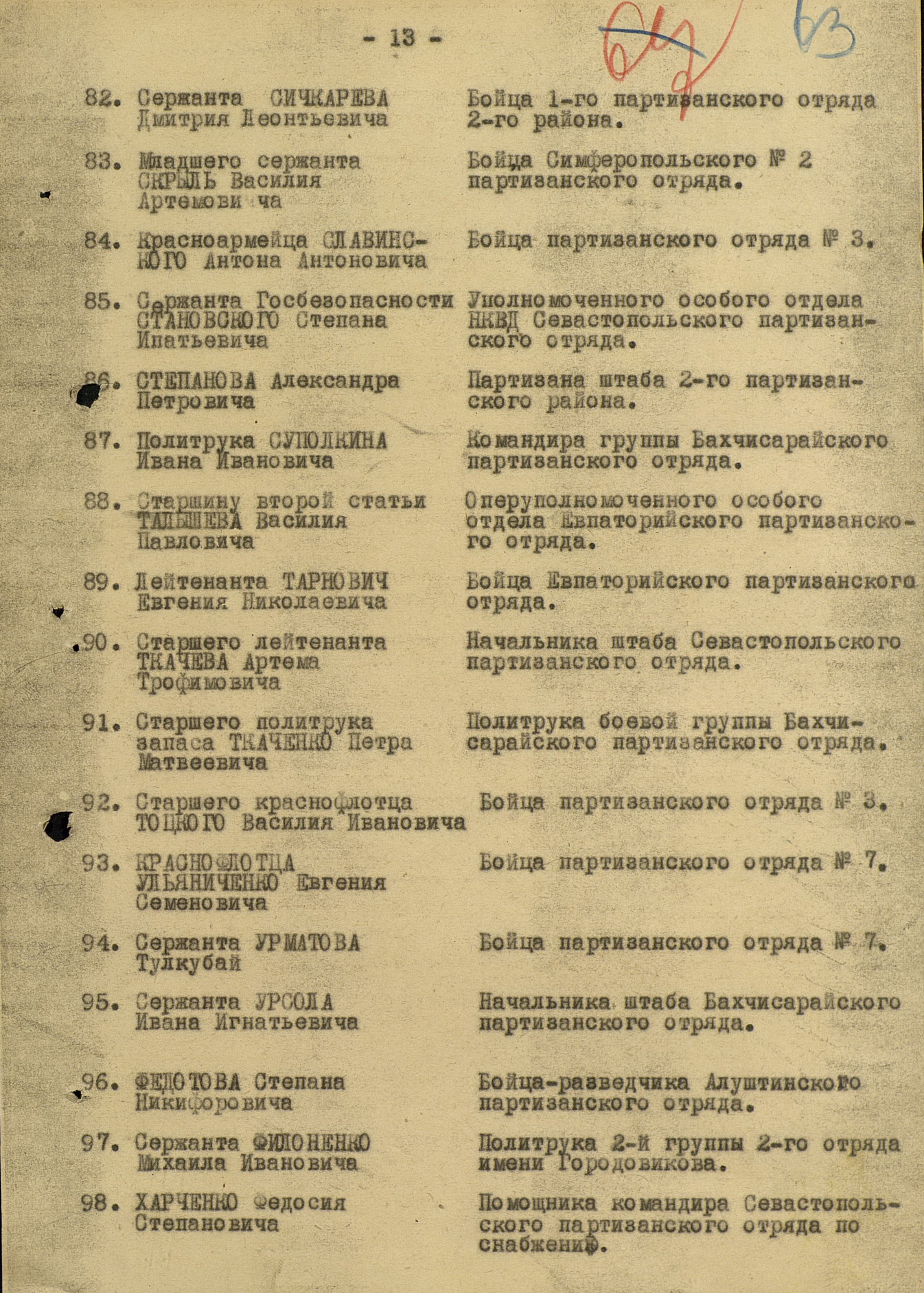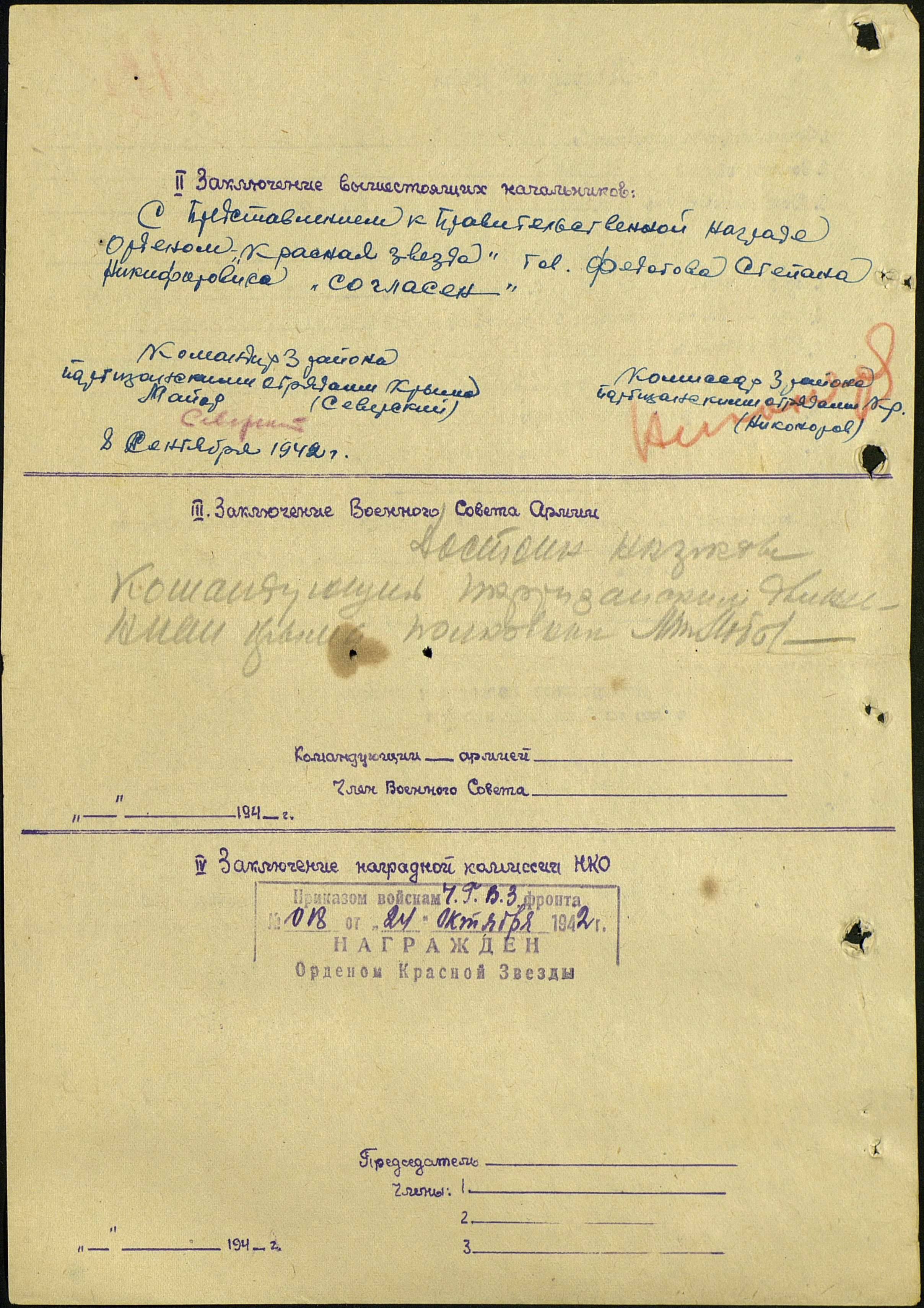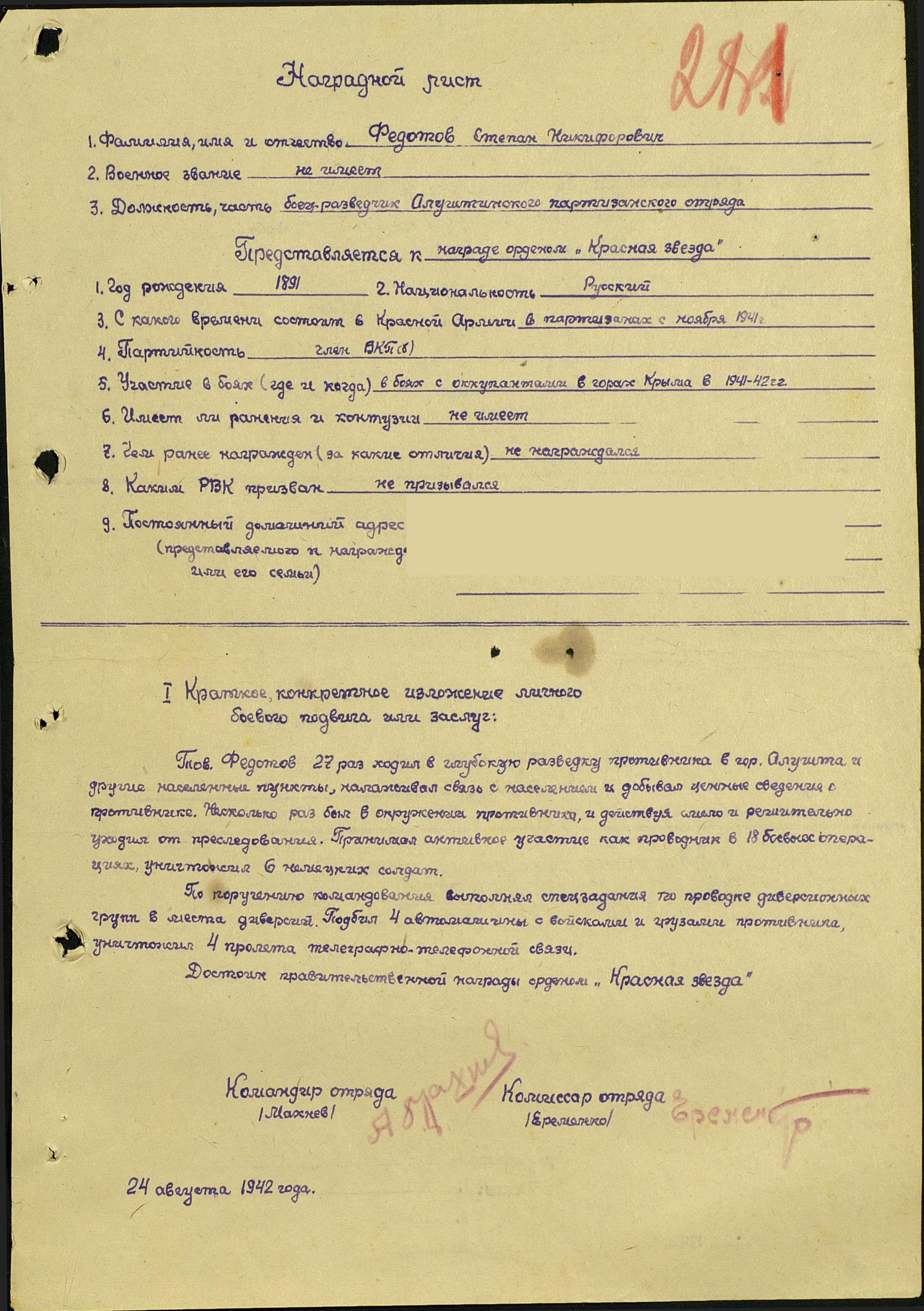 Из наградного листа: тов. Федотов 27 раз ходил в глубокую разведку противник в г. Алушта, и другие населенные пункты, налаживал связь с населением и добывал ценные сведения о противнике. Несколько раз был в окружении противника и действуя смело и решительно уходил от преследования. Принимал активное участие как проводник в 18 боевых операциях, уничтожил 6 немецких солдат. По поручению командования выполнял спецзадания по по проводке диверсионных групп в места диверсий. Подбил 4 автомашиы с войсками и грузами противника, уничтожил 4 пролета телефонно- телеграфной связи.