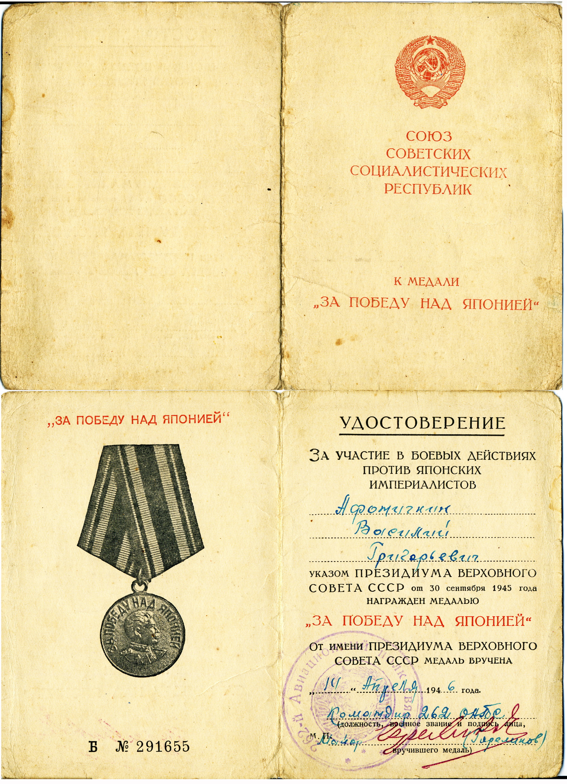 Принимал участие в войне с Японией в полку спецсвязи; на его самолете были доставлены в распоряжение частей Квантунской армии в Манчжурии парламентеры советской стороны по переговорам с японцами о капитуляции. Окончил воевать мой отец 2 сентября 1945 года после безоговорочной капитуляции милитаристской Японии. Папа награжден медалью « За Победу над Японией».