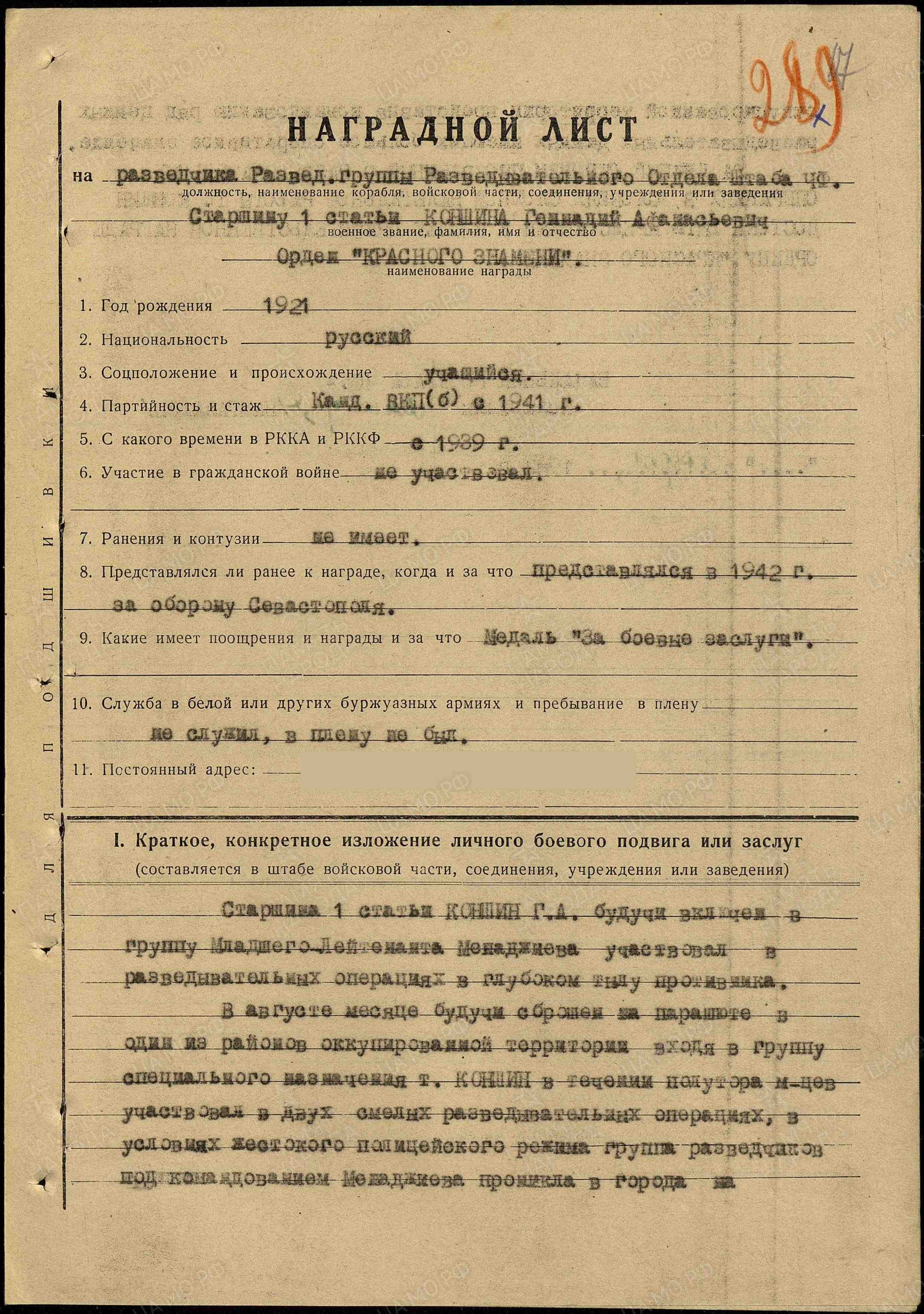 поделиться с вами общей нашей радостью по поводу награждения вашего сына высокой правительственной наградой. Командующий Черноморским флотом вице-адмирал Ф.С. Октябрьский за образцовое выполнение боевых заданий на фронте борьбы с немецкими захватчиками проявление при этом доблести и мужества наградил Вашего сына Геннадия Коншина медалью «За боевые заслуги».