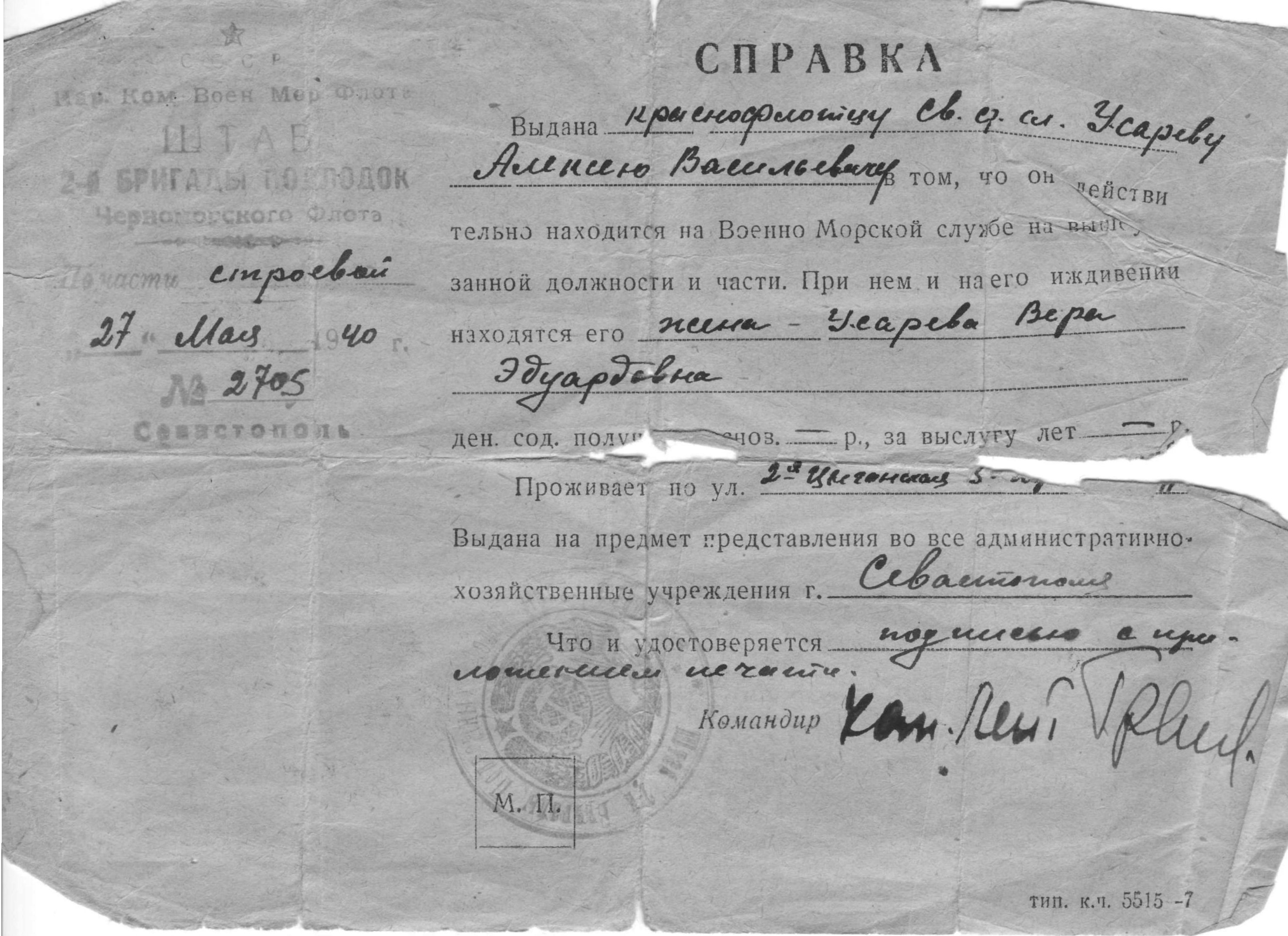 Мой дед Усарев Алексей Васильевич 1912 года родился в городе Камышлов Свердловской области. Проходил срочную, а затем сверхсрочную службу на крейсере «Профинтерн», а затем во 2-й бригаде подводных лодок. Участвовал в обороне Севастополя в составе 8-й бригады морской пехоты. У меня сохранились его письма - переписка со своей женой, т.е моей бабушкой, две его фотографии. Последнее письмо, полученное от него на Кавказе, было от 7 июня 1942 года. Когда наши войска отходили в Камышовую бухту и к 35 батарее, он заходил к своим знакомым по фамилии Долговы, которые предложили ему переодеться в гражданское и остаться у них, но он отказался, сказал, что пойдет в Камышовую бухту и попытается прорваться к своим на Кавказ, а если не получится, то пустит себе пулю в лоб. Больше его никто не видел. После войны получили извещение, что 3 июля он пропал без вести. Такое извещение тогда получали многие .