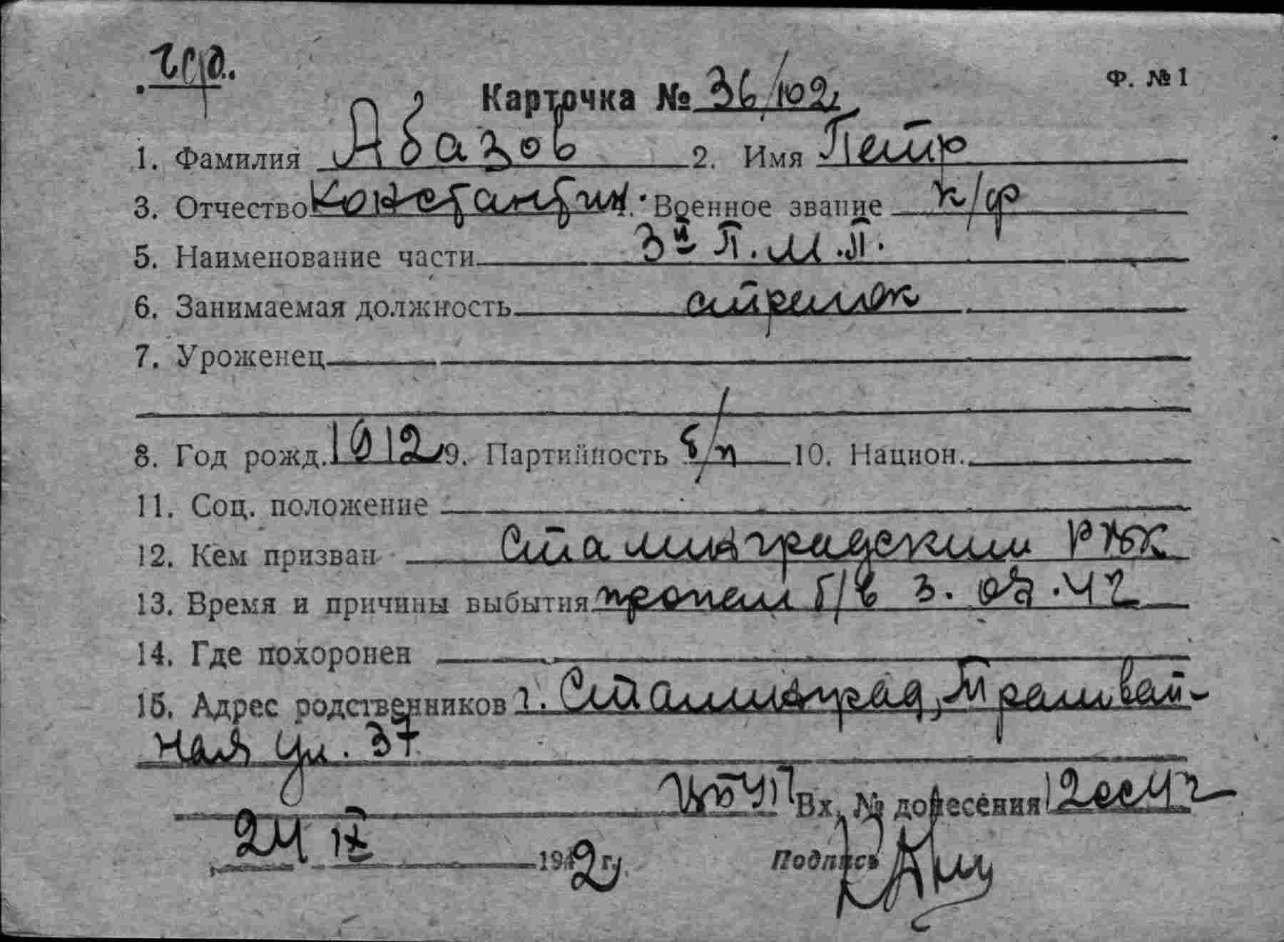 ЦВМА Картотека безвозвратных потерь; ЦВМА ф.1250,о.2,д.415-А; ЦВМА ф.864,о.1,д.1315