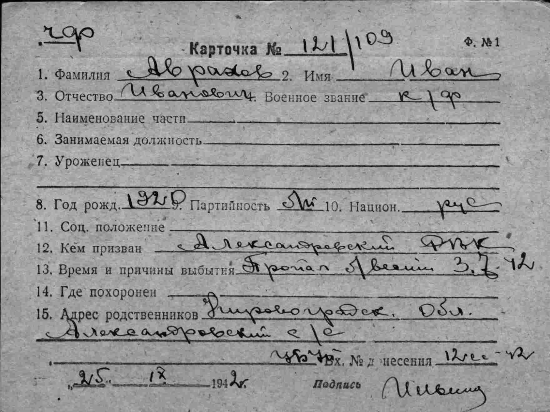 Место призыва: Александровский РВК, Украинская ССР, Кировоградская обл., Александровский р-н