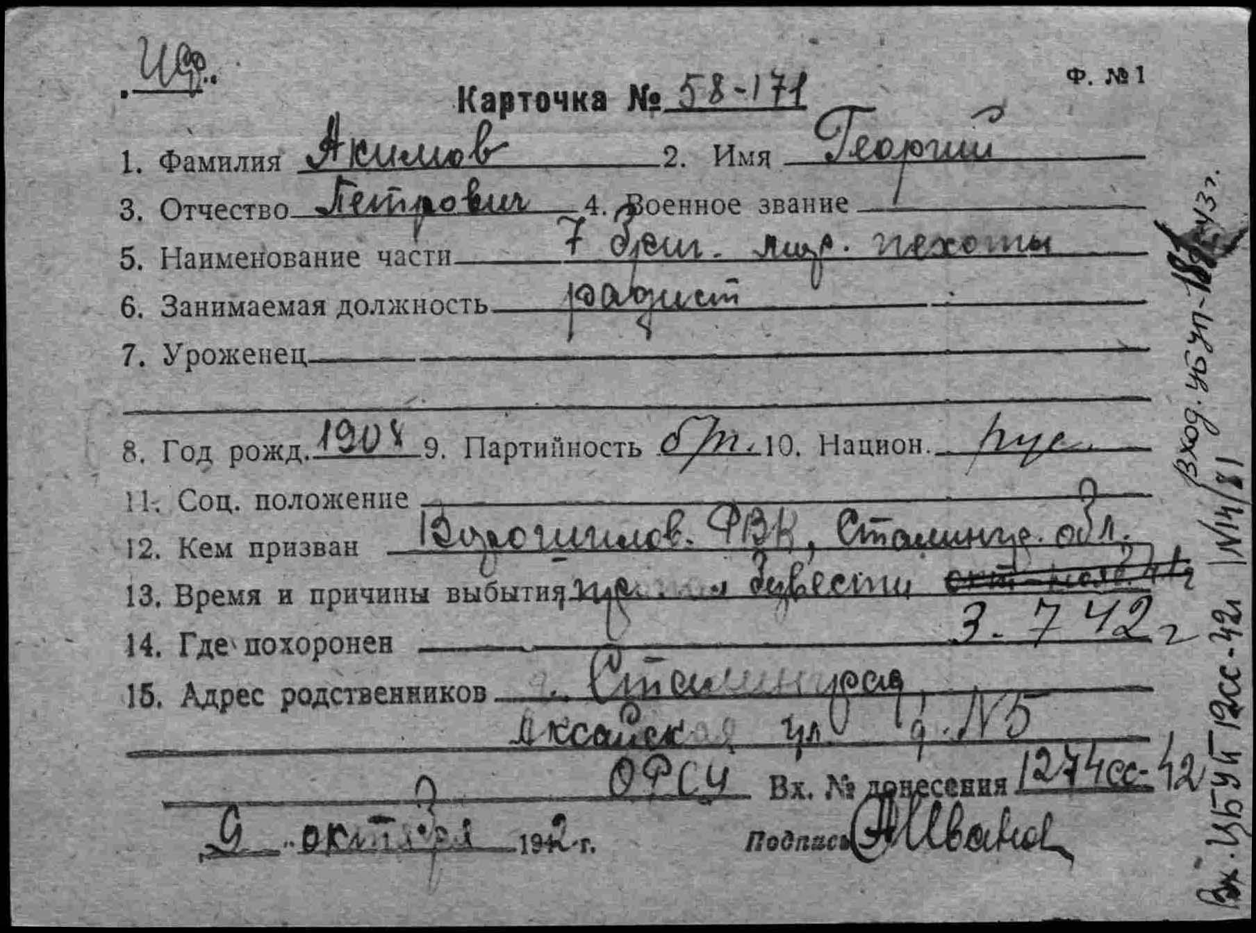 Место призыва: Ворошиловский РВК, Сталинградская обл., Ворошиловский р-н