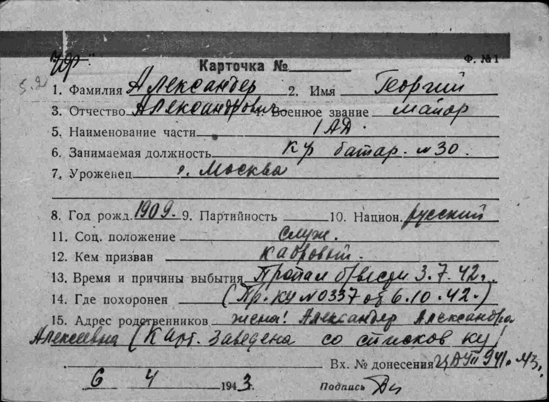 ...24 июня Александер с группой бойцов, расширив канализационный водосток, вышли в долину, но гитлеровцы обнаружили их и открыли огонь. Александеру и нескольким бойцам удалось прорваться. Майор был в штатском, но через сутки его схватили, так как один предатель из местного населения опознал его и выдал фашистам. Александера направили в тюрьму в Симферополь. Там фашисты долго его уговаривали перейти на их сторону, но Александер решительно отверг все предложения врагов. Тогда его стали пытать, не раз избивали и в конце концов убили. Заключенные видели, как его окровавленный труп вынесли из камеры. Г. А. Александер геройски погиб за счастье своего народа, свою Родину.