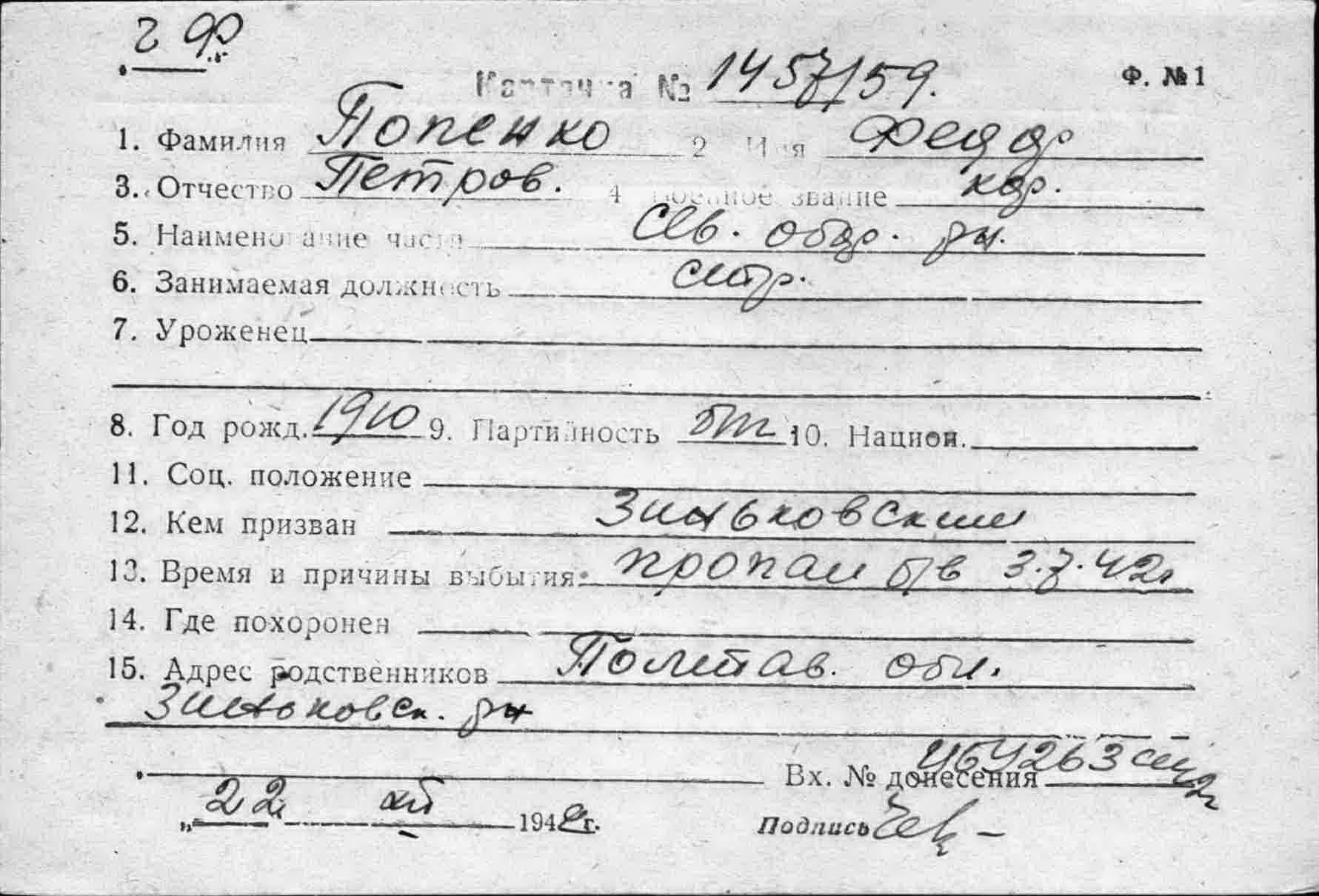 Место призыва: Зеньковский РВК, Украинская ССР, Полтавская обл., Зеньковский р-н