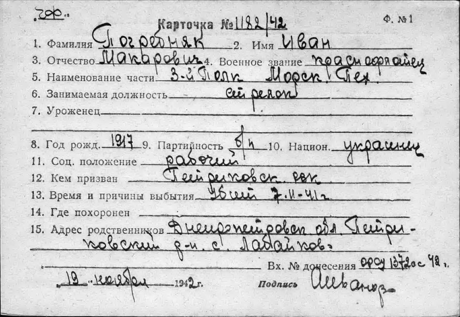 Место призыва: Петриковский РВК, Украинская ССР, Днепропетровская обл., Петриковский р-н