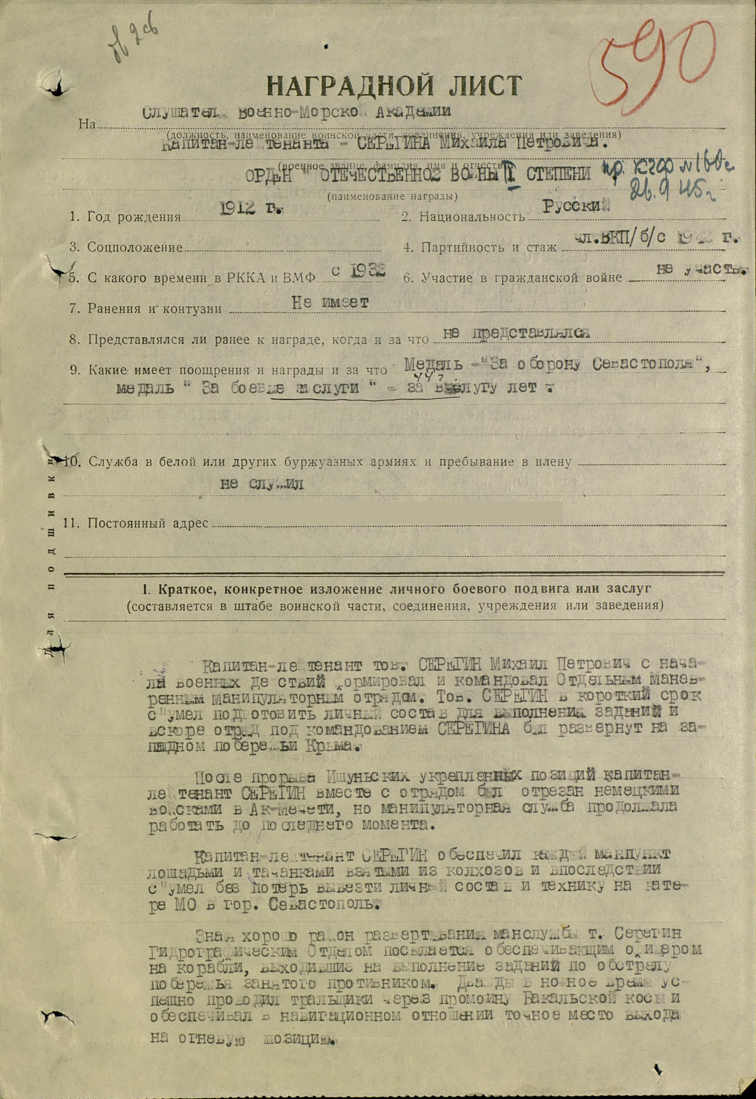 Дедушка не очень охотно рассказывал о войне, но один из его рассказов, с его слов записан в книге "Гидрография Черноморского флота 1696-1982", изданной в Севастополе в 1984 году.
