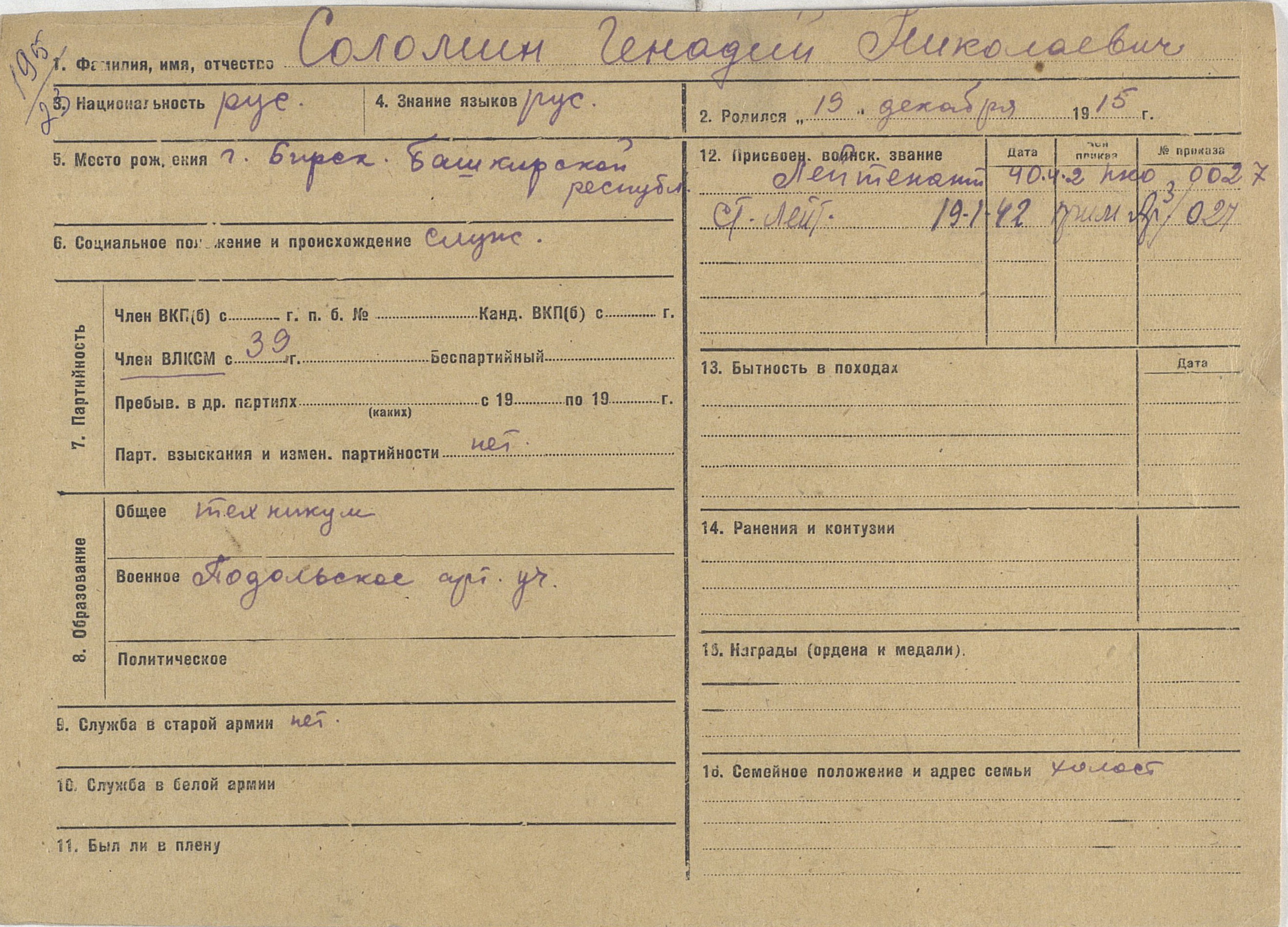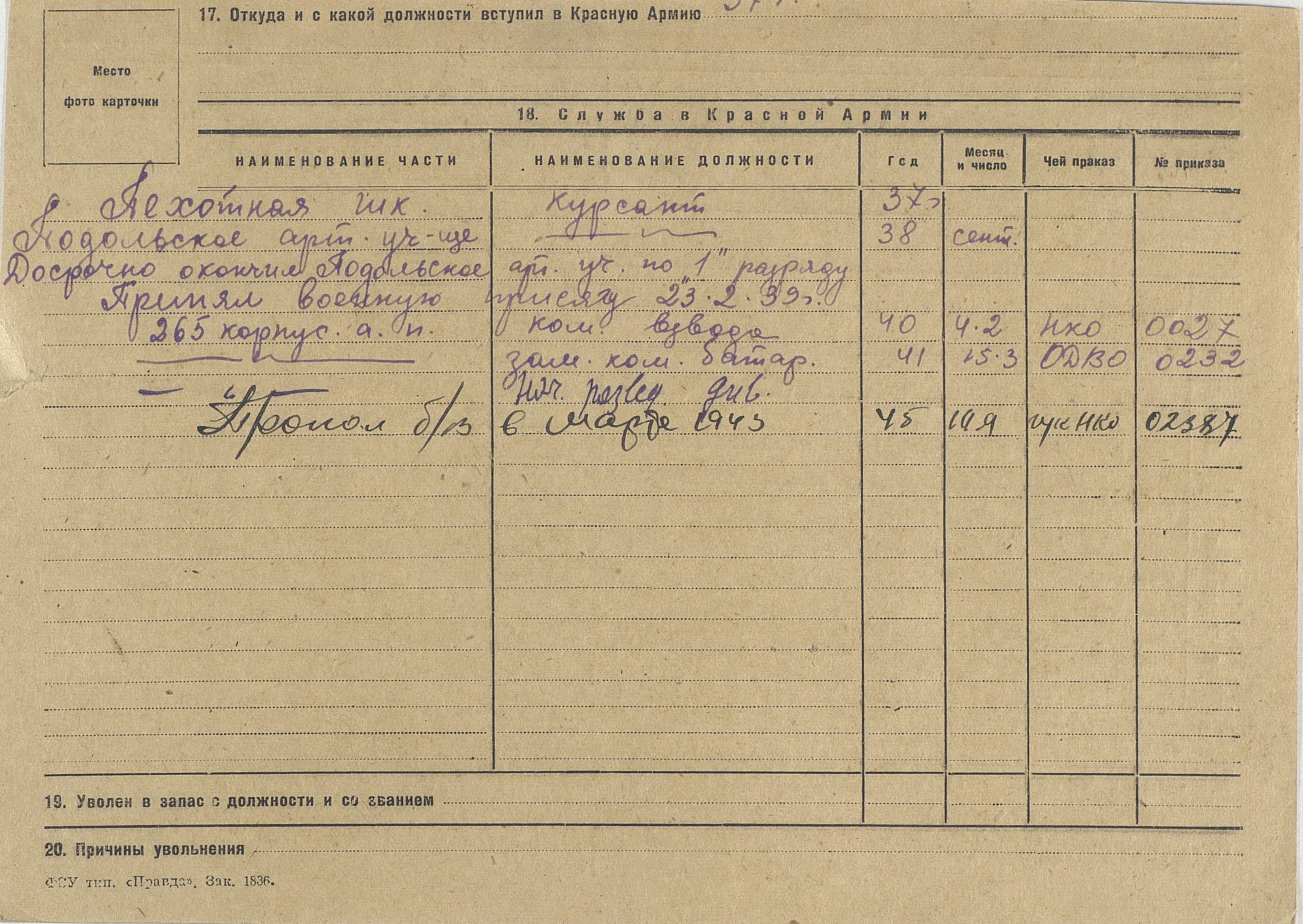 В 1940г. закончил Подольское Артиллерийское училище (группа 520 с изучением английского языка).