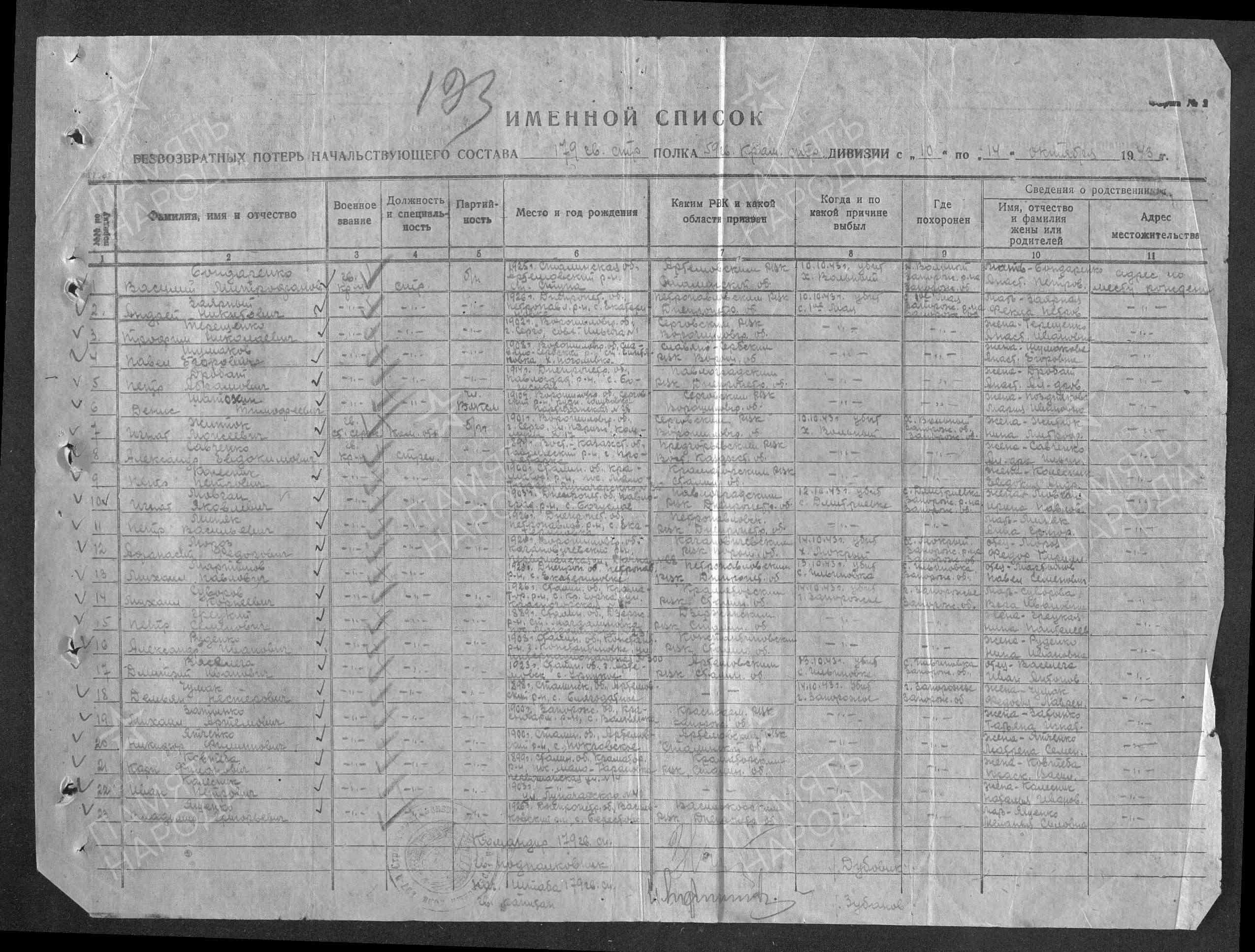 Информация: ЦВМА Картотека безвозвратных потерь; ЦВМА документы; РГВА ф.32880,о.1,д.169; РГВА ф.32885,о.1,д.267; ЦАМО ф.58,о.18001,д.971