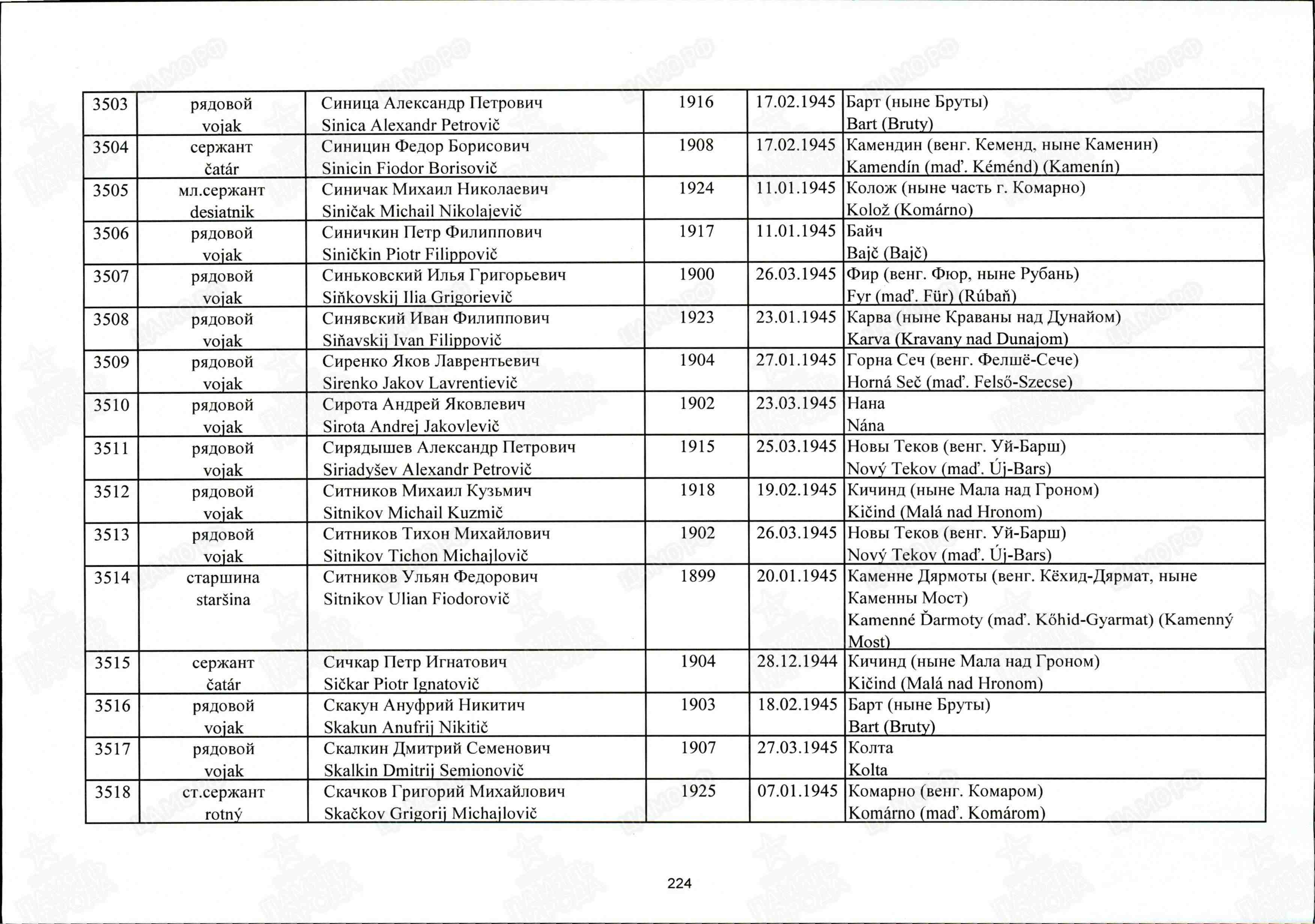Дополнительно: Попал в плен (освобожден). 23.03.1945 погиб. Первичное место захоронения: Венгрия, с. Нана, северо-западная окраина, братская могила № 2, ряд 2, 2-й слева направо. Страна захоронения: Республика Словакия. Регион захоронения: Нитранский край. Место захоронения: Новы Замки р-н, г. Штурово, ул. Святого Штефана (бывш. Швермова). Откуда перезахоронен: Нана
