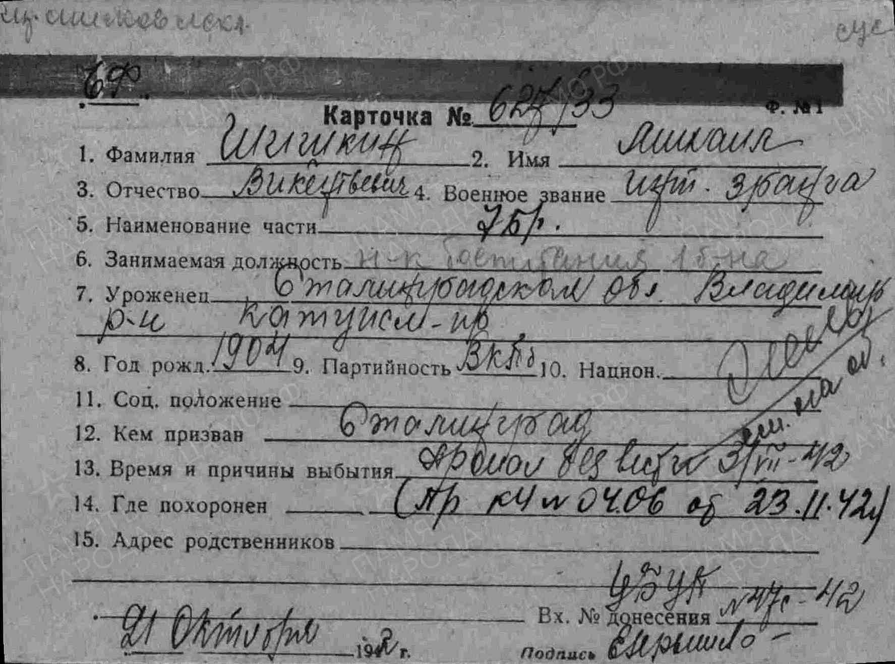 ЦВМА Картотека безвозвратных потерь; ЦВМА документы; ЦАМО ф.58,о.977528,д.144
