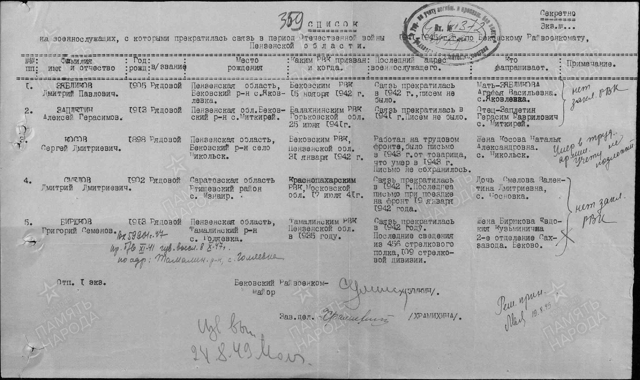 Хочу рассказать Вам о защитнике Севастополя 1941-1942 г.г. Мой дедушка, Бирюков Григорий Семенович, рожденный 14 октября 1913 года, призванный Тамалинским РВК в 1935 году, так написано в РВК. Жена - Бирюкова Евдокия Кузьминична, эвакуировалась к сестре в с.Голяевка Пензенская область Тамалинский район. Было четверо малышей, двое умерли вскоре после эвакуации, а до эвакуации они жили с моим дедушкой в порту Хорлы Николаевской или Херсонской области. Мы его искали, делали запрос в архивы, но ничего это не давало, не знали даже номер части где он служил, и только совсем недавно, в Подольске дали нам архивную справку, с помощью которой мы что то о нем узнали. Мл.лейтенант, заместитель командира стрелковой роты, 456 стрелкового полка 109 стрелковой дивизии. Связь с ним прекратилась в ноябре 1941 года, но пропал без вести в документах стоит июль 1942 года, а в других стоит 1. 07. 1942 года. Это все что мы знаем о нем.