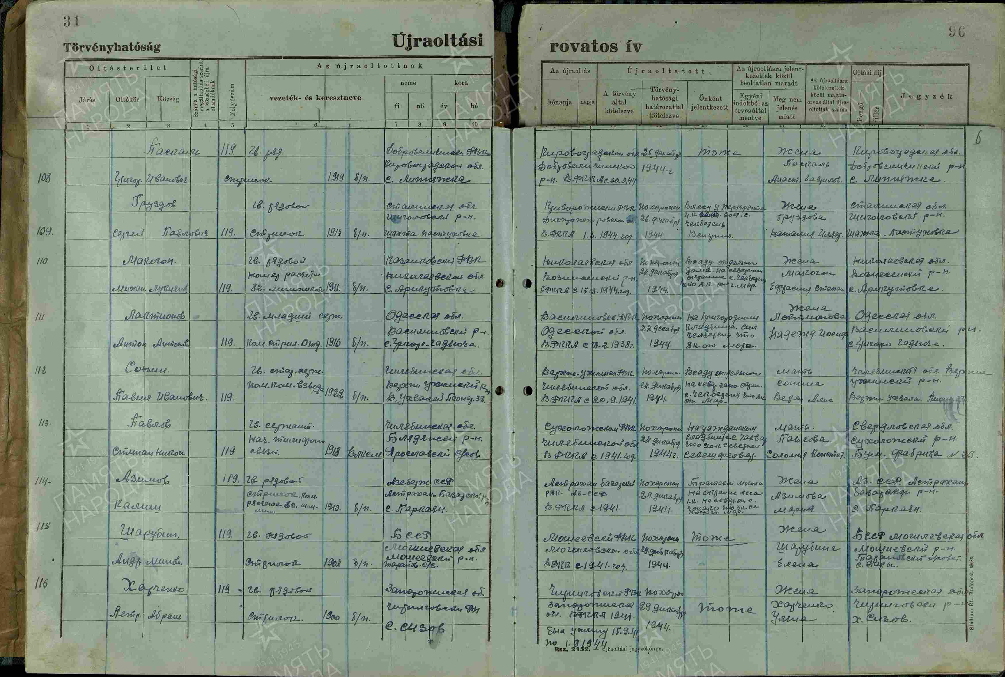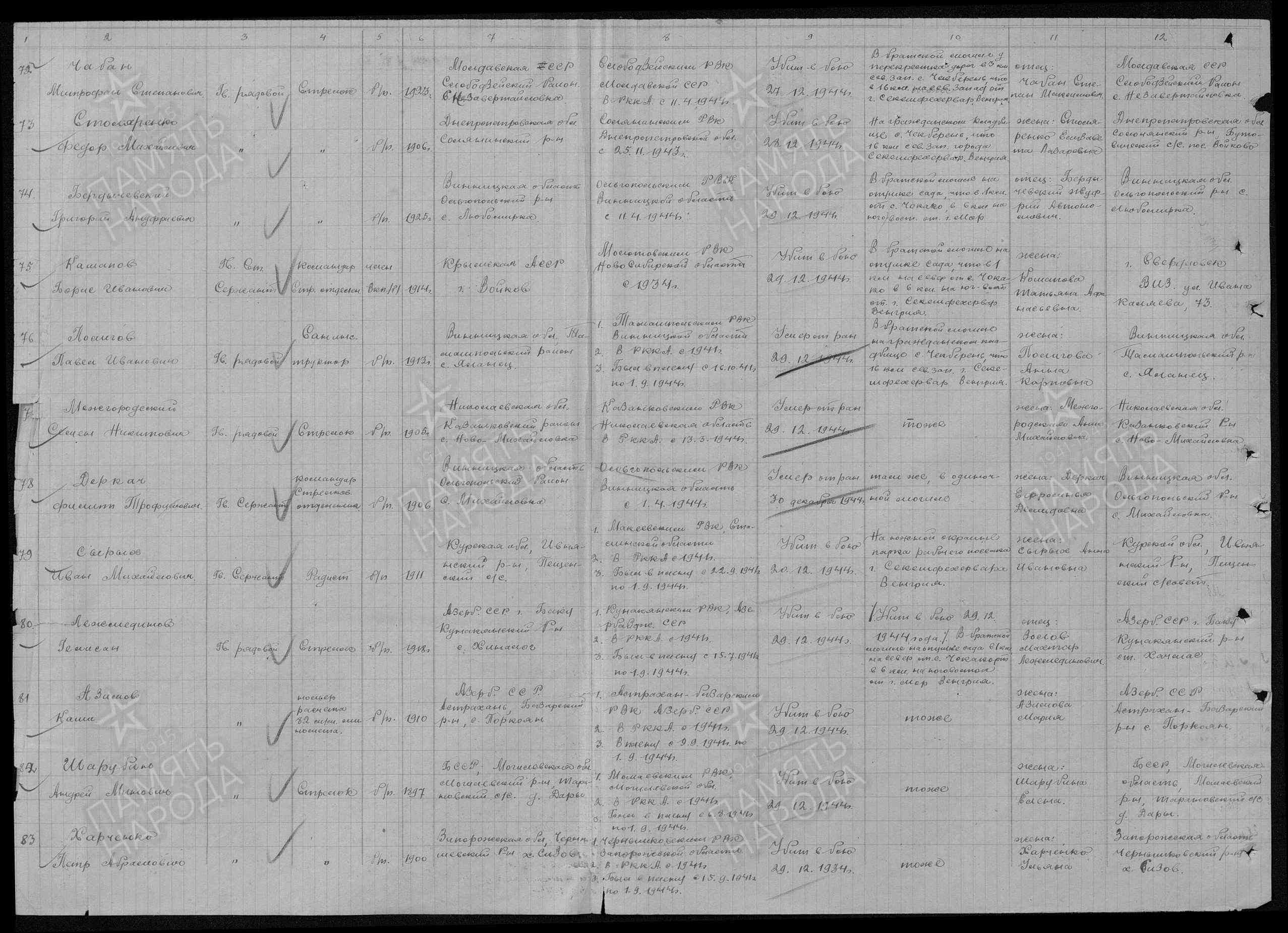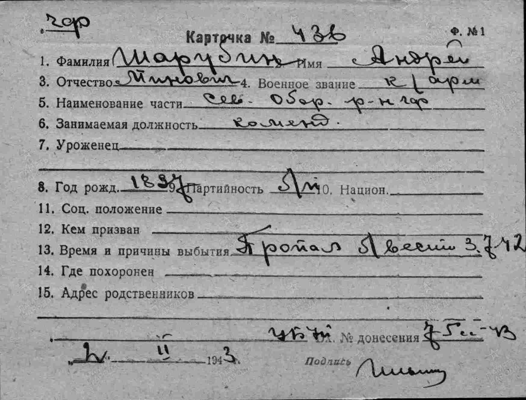 Дополнительно: 27.06.1942 попал в плен (освобожден). 29.12.1944 погиб. Первичное место захоронения: Венгрия, варм. Фейер, г. Мор, юго-восточнее, 6 км, 1 км от с. Чокаке на север, опушка сада, братская могила